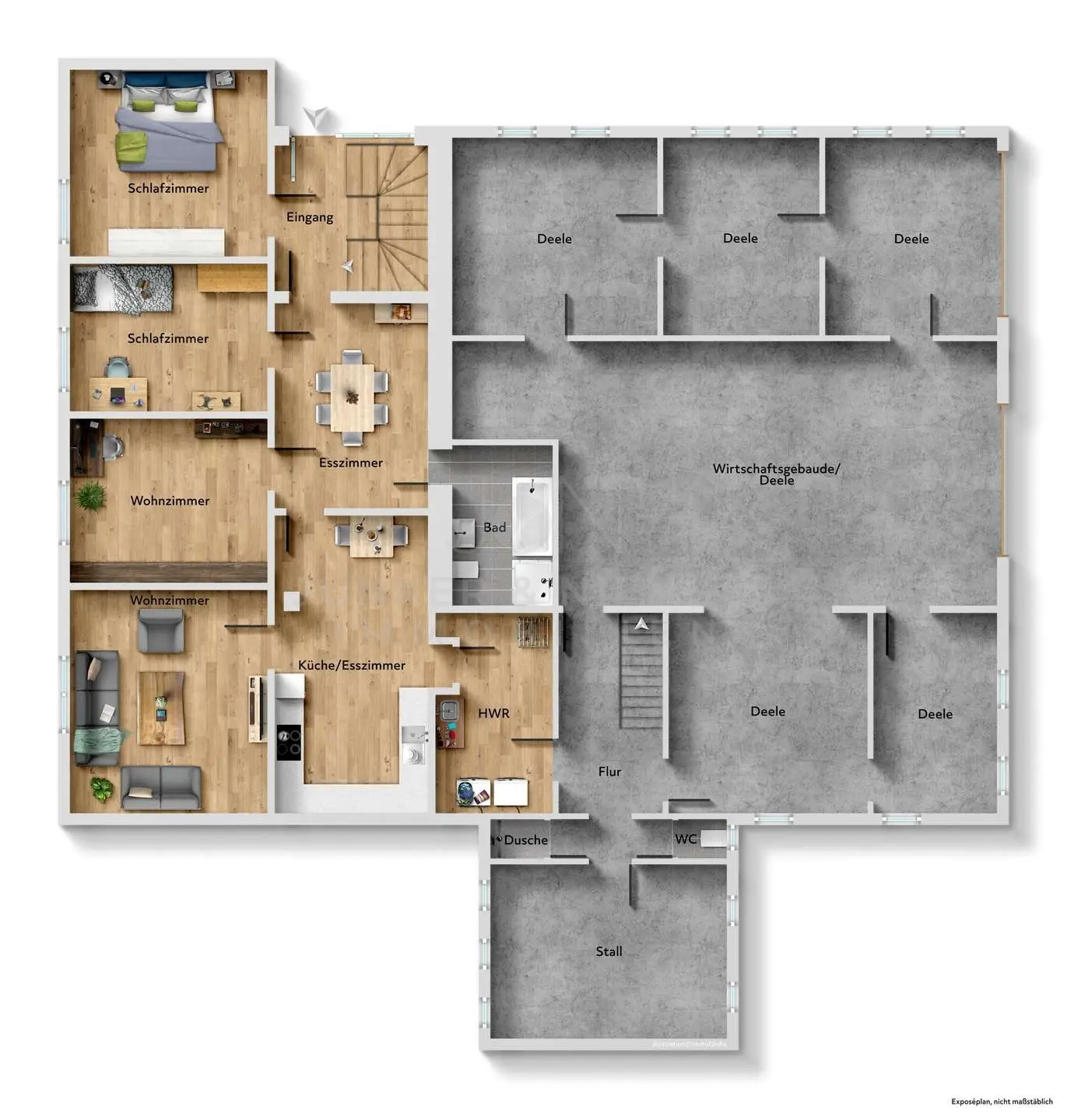 Die Erdgeschosswohnung überzeugt durch ein Esszimmer, einen gemütlichen Wohnbereich sowie eine große Küche, die zusätzlich über einen Kaminofen verfügt und so für eine besonders behagliche Atmosphäre sorgt. Die Küche bietet zudem direkten Zugang zur weitläufigen Deele, die zusätzliche Nutzfläche und vielfältige Gestaltungsmöglichkeiten bietet. Ergänzt wird diese Ebene durch ein Badezimmer mit Dusche und Badewanne sowie zwei individuell nutzbare Zimmer, die sich flexibel als Schlaf-, Arbeits- oder Gästezimmer eignen.