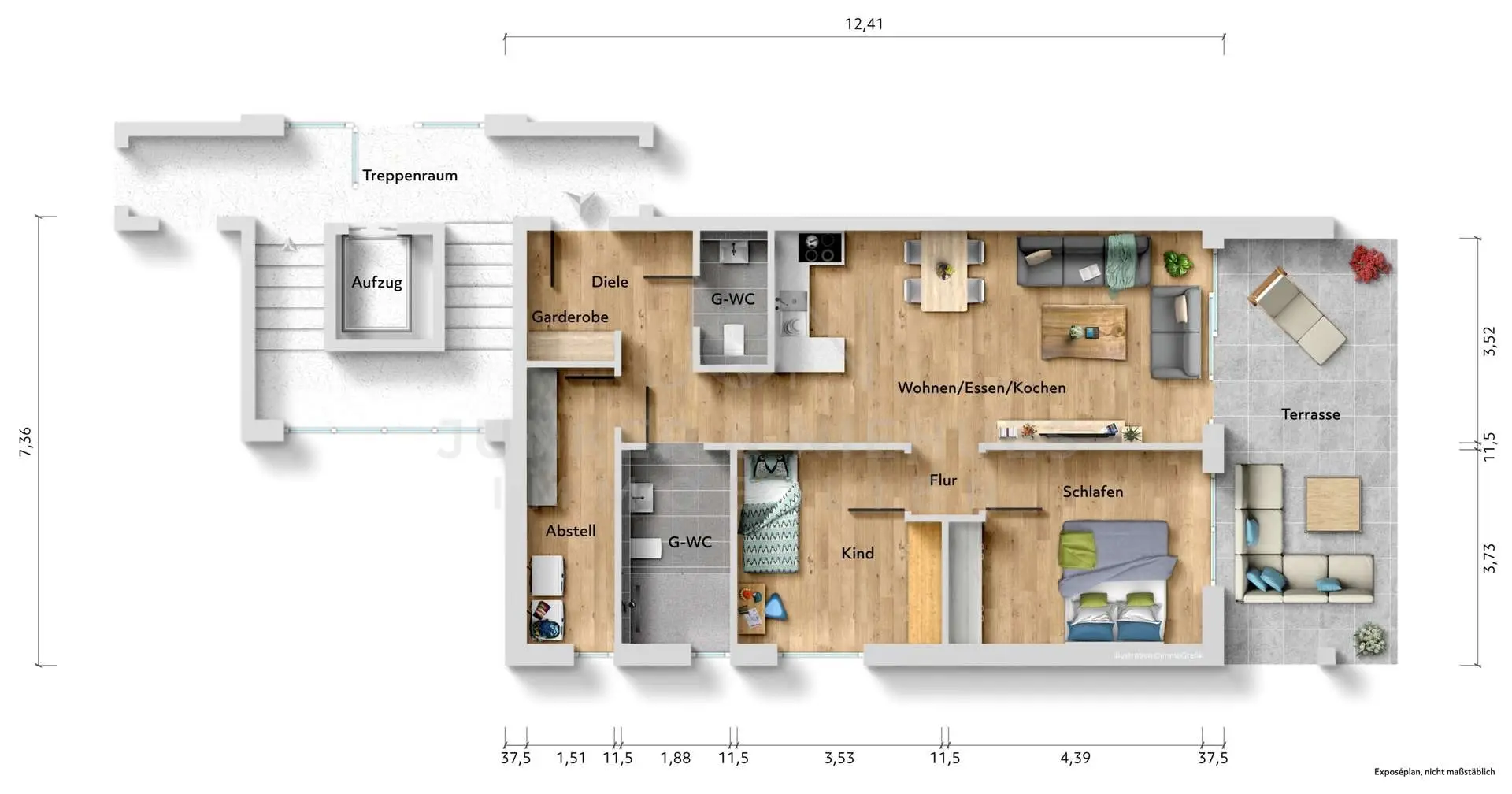 Beim Betreten der Wohnung empfängt Sie ein großzügiger Flur, der Zugang zu allen Räumen bietet. Direkt vom Flur aus gelangen Sie in das elegante Badezimmer, das mit einer modernen Dusche ausgestattet ist, sowie in das separate WC – ideal für Gäste. Ein praktischer Abstellraum sorgt dafür, dass Haushaltsgegenstände und Vorräte bequem verstaut werden können, ohne den Wohnbereich zu beeinträchtigen.