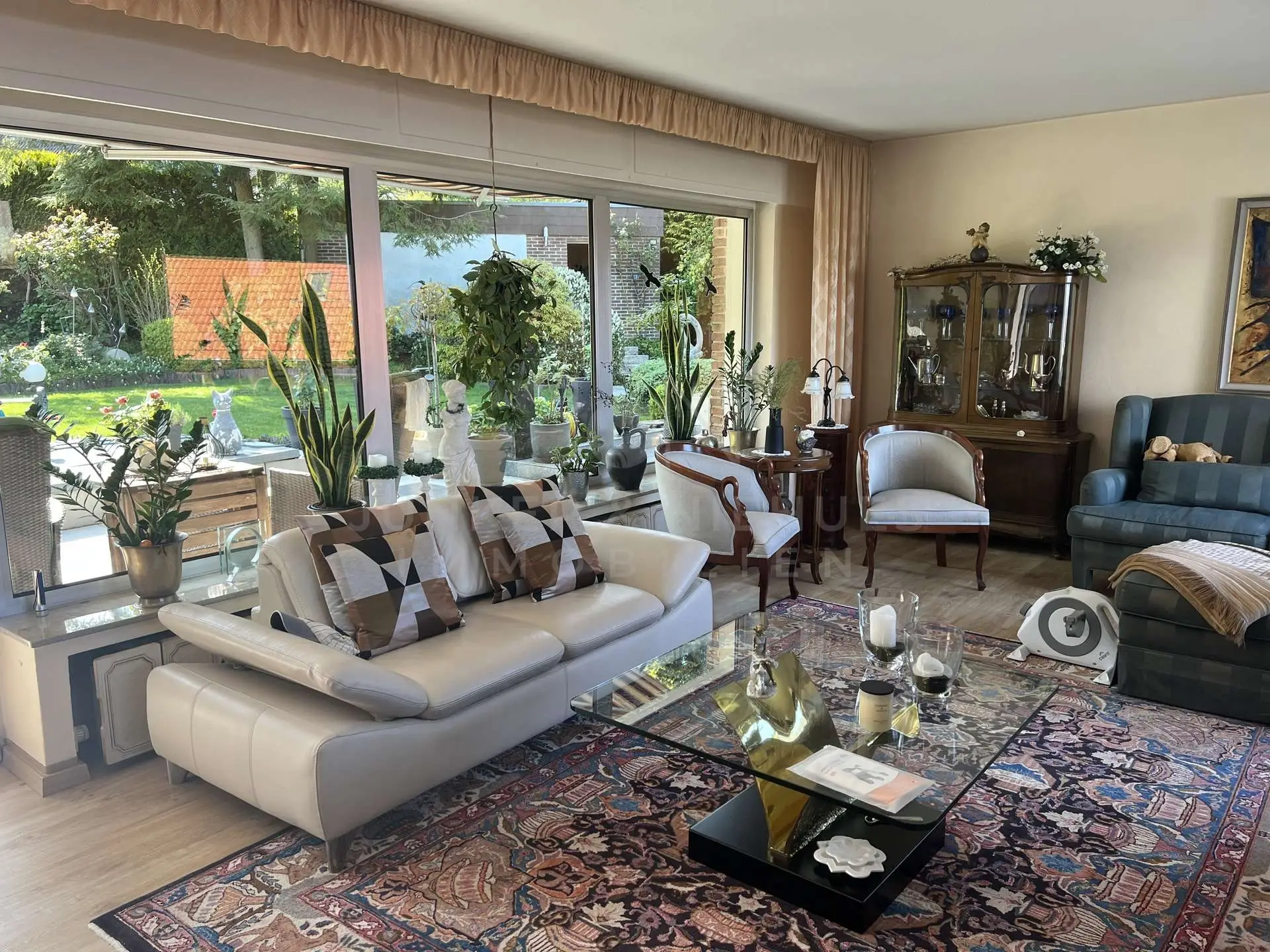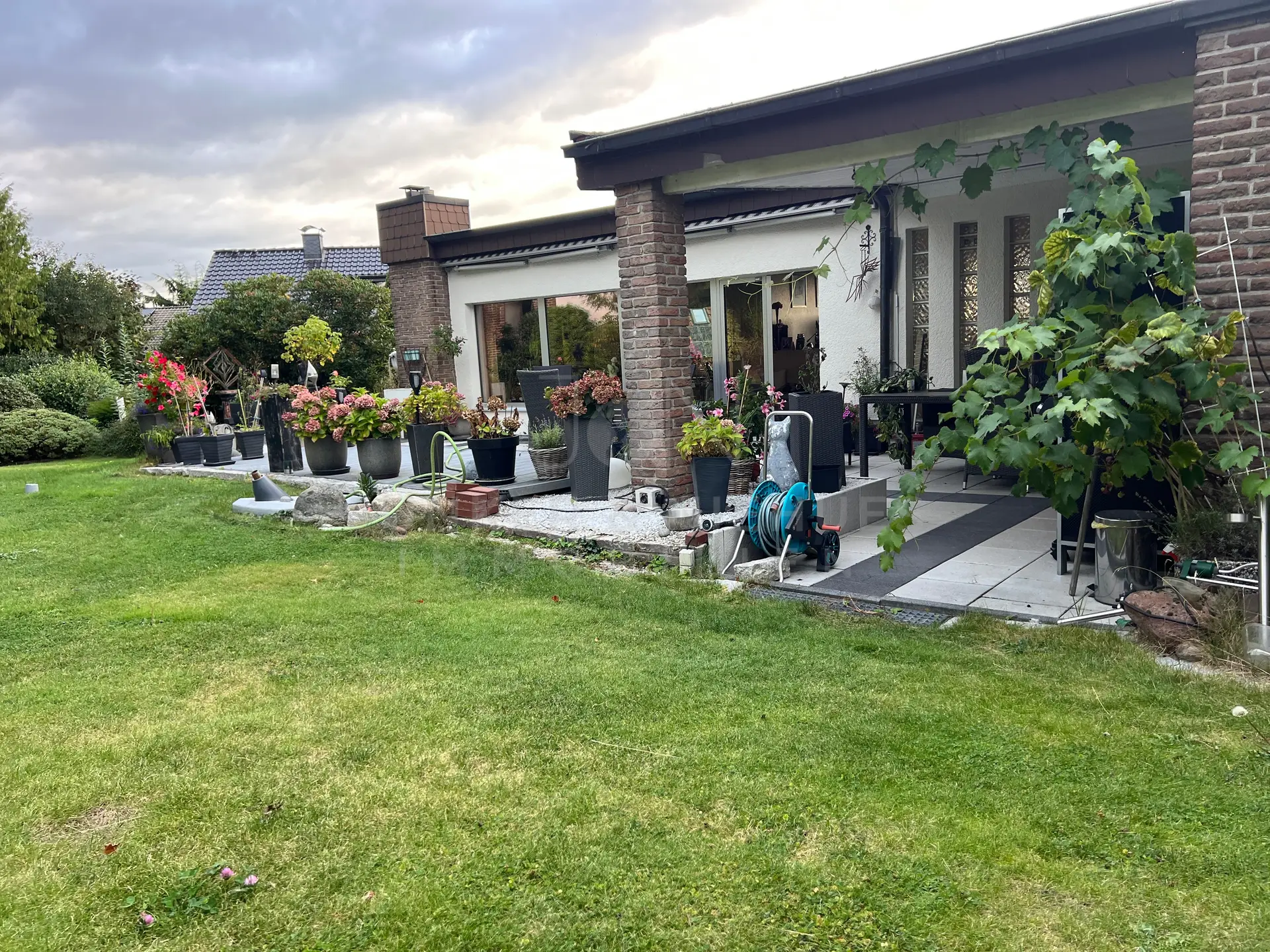 Von den Wohnräumen aus gelangen Sie auf die große Terrasse, die viel Platz für Gartenmöbel und entspannte Stunden im Freien bietet. Ein Grillbereich lädt zu gemütlichen Sommerabenden mit Familie und Freunden ein – hier wird der Außenbereich zu einem echten Highlight. Besonders hervorzuheben ist das charmante Reetdach-Gartenhaus, das dem Garten eine besondere Note verleiht. Zusätzlich befindet sich hinter dem Haus ein weiteres Gartenhaus, das vielfältige Nutzungsmöglichkeiten bietet.
