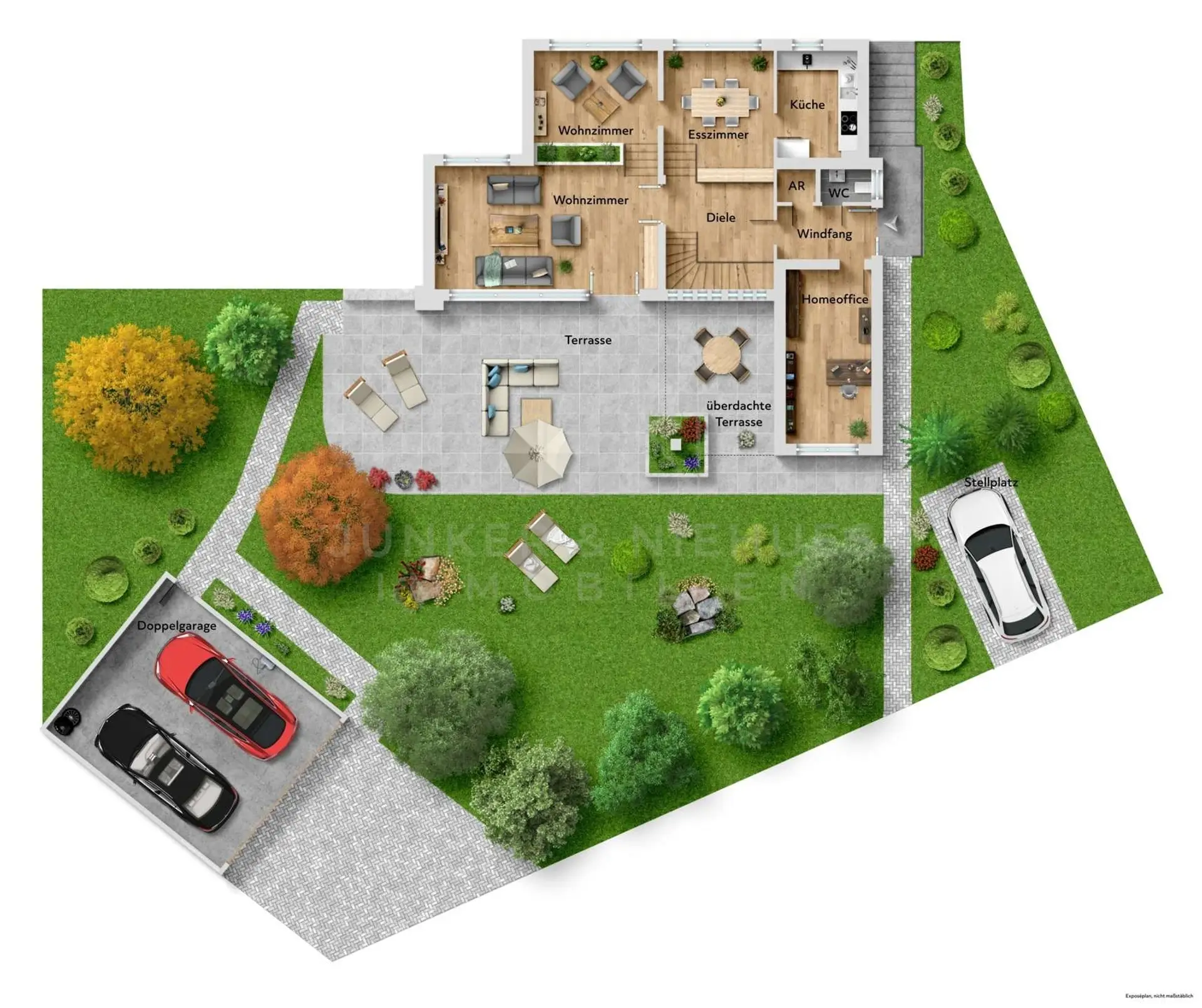 Das Grundstück umfasst insgesamt ca. 1.033 m² und bietet viel Platz für Gartenfreunde, Spielflächen oder erholsame Stunden im Grünen. Eine Doppelgarage mit ca. 41 m² sorgt für komfortables Parken und zusätzlichen Stauraum; hier ist eine Wallbox für Elektrofahrzeuge installiert. Abgerundet wird dieses besondere Angebot durch den einzigartigen Ausblick.