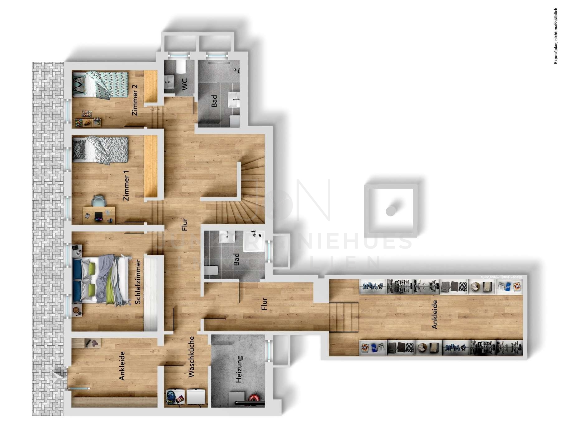 Das Untergeschoss, das sich aufgrund der Hanglage bestens nutzen lässt, bietet zwei geräumige Schlafzimmer sowie ein weiteres Zimmer, das sich ideal als Gästezimmer oder Kinderzimmer eignet. Ergänzt wird diese Ebene durch zwei Bäder und ein weiteres WC. Es stehen Ihnen im Souterrainbereich ca. 60 m² Nutzfläche zur Verfügung, in denen sich unter anderem der ehemalige Schwimmbadbereich (wird zur Zeit als Ankleide genutzt) sowie ein Hauswirtschaftsbereich befinden – mit überschaubarem Aufwand lässt sich der ehemalige Schwimmbadbereich wieder zurückverwandeln und bietet zusätzlichen Freizeit- und Wohlfühlwert.