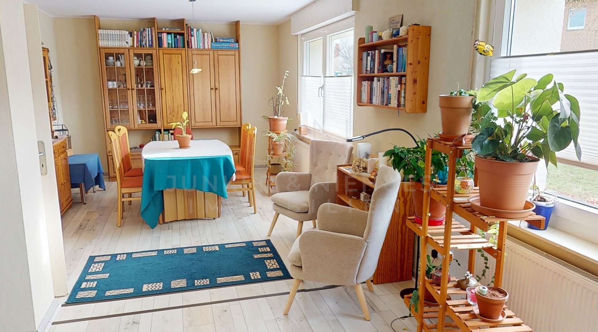 Im Erdgeschoss befindet sich ein großzügiges Wohnzimmer mit ca. 30 m², das durch seine Helligkeit und den Blick in den Garten besticht. Ein gemütlicher Kaminofen sorgt hier in der kalten Jahreszeit für wohlige Wärme und eine behagliche Atmosphäre. Eine separate Küche mit Platz für eine Essecke, ein Tageslichtbad, eine einladende Diele sowie ein zusätzliches Zimmer, das sich ideal als Büro oder Gästezimmer eignet, vervollständigen diese Ebene.