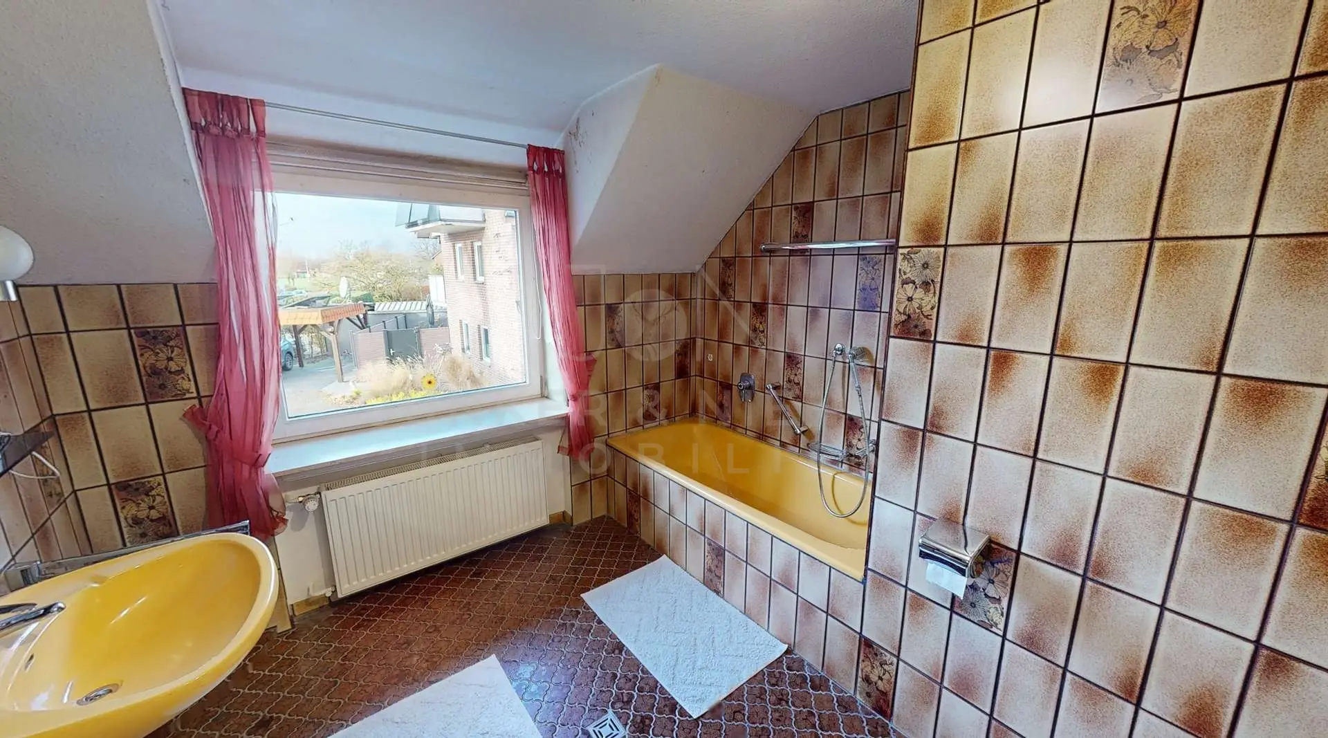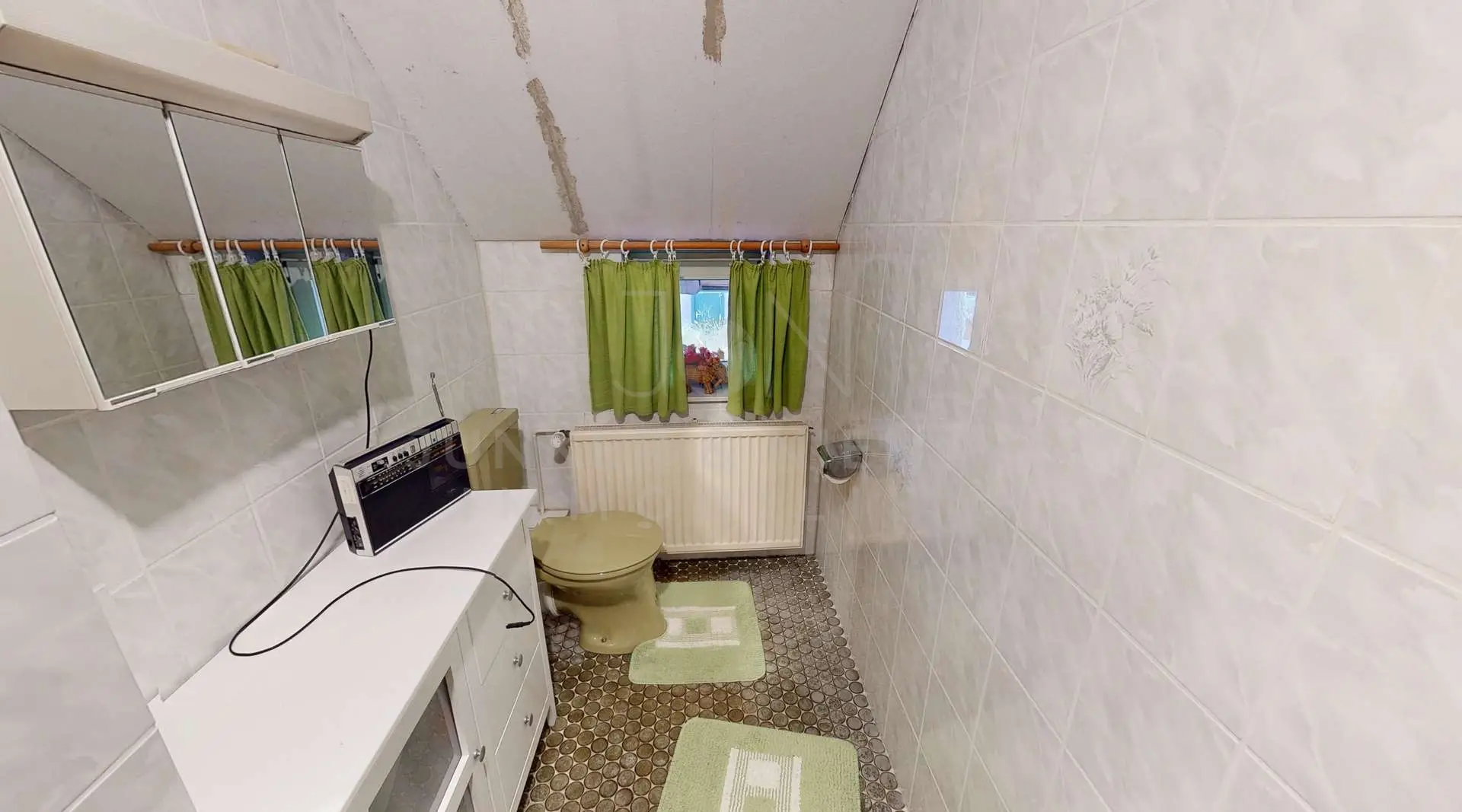 Für hohen Wohnkomfort sorgen die zwei Bäder im Dachgeschoss. Das größere Bad ist mit einer Badewanne ausgestattet und lädt zu entspannten Momenten ein, während das zweite Bad über eine Dusche und ein WC verfügt und somit eine ideale Ergänzung für den Familienalltag darstellt. Diese Aufteilung ermöglicht eine reibungslose Nutzung auch bei mehreren Bewohnern und unterstreicht die Familienfreundlichkeit der Immobilie.