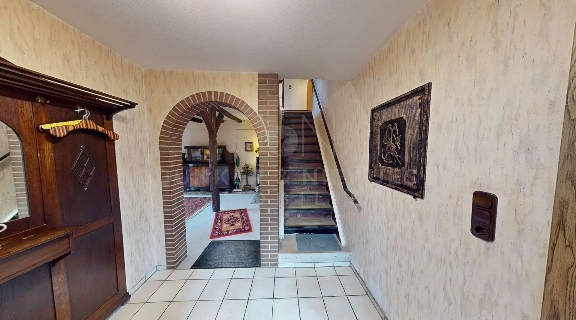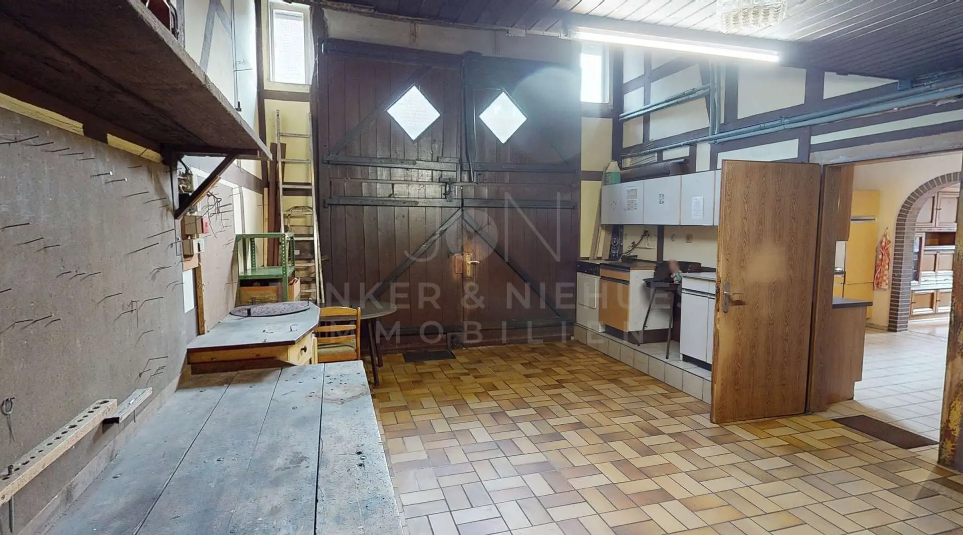 Schon beim Betreten der Wohnung wird der besondere Charakter des Objekts spürbar. Die weitläufige Diele bildet das Herzstück des Erdgeschosses und vermittelt ein offenes, einladendes Raumgefühl. Von hier aus erschließen sich die zentralen Wohnbereiche auf angenehme und logisch strukturierte Weise. Das Esszimmer liegt in unmittelbarer Nähe zur Küche und eignet sich hervorragend als kommunikativer Mittelpunkt für gemeinsame Mahlzeiten und gesellige Abende. Die Küche selbst ist großzügig geschnitten und verfügt über einen separaten Abstellraum, der zusätzlichen Stauraum für Vorräte und Haushaltsgeräte bietet. Durch den direkten Zugang zur Deele sind kurze Wege und eine optimale Nutzung der Fläche gewährleistet.