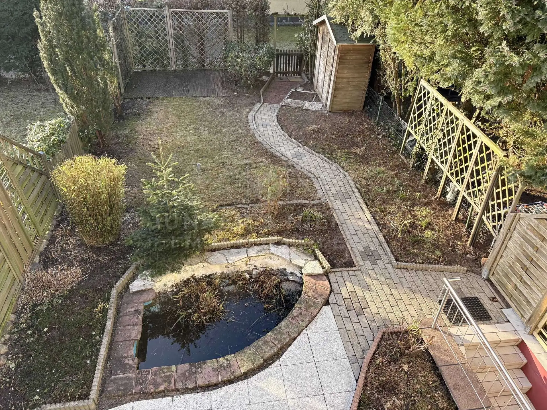 Dieser lädt mit viel Grün zum Entspannen ein und wird durch einen schönen kleinen Teich zu einer besonderen Wohlfühlatmosphäre.