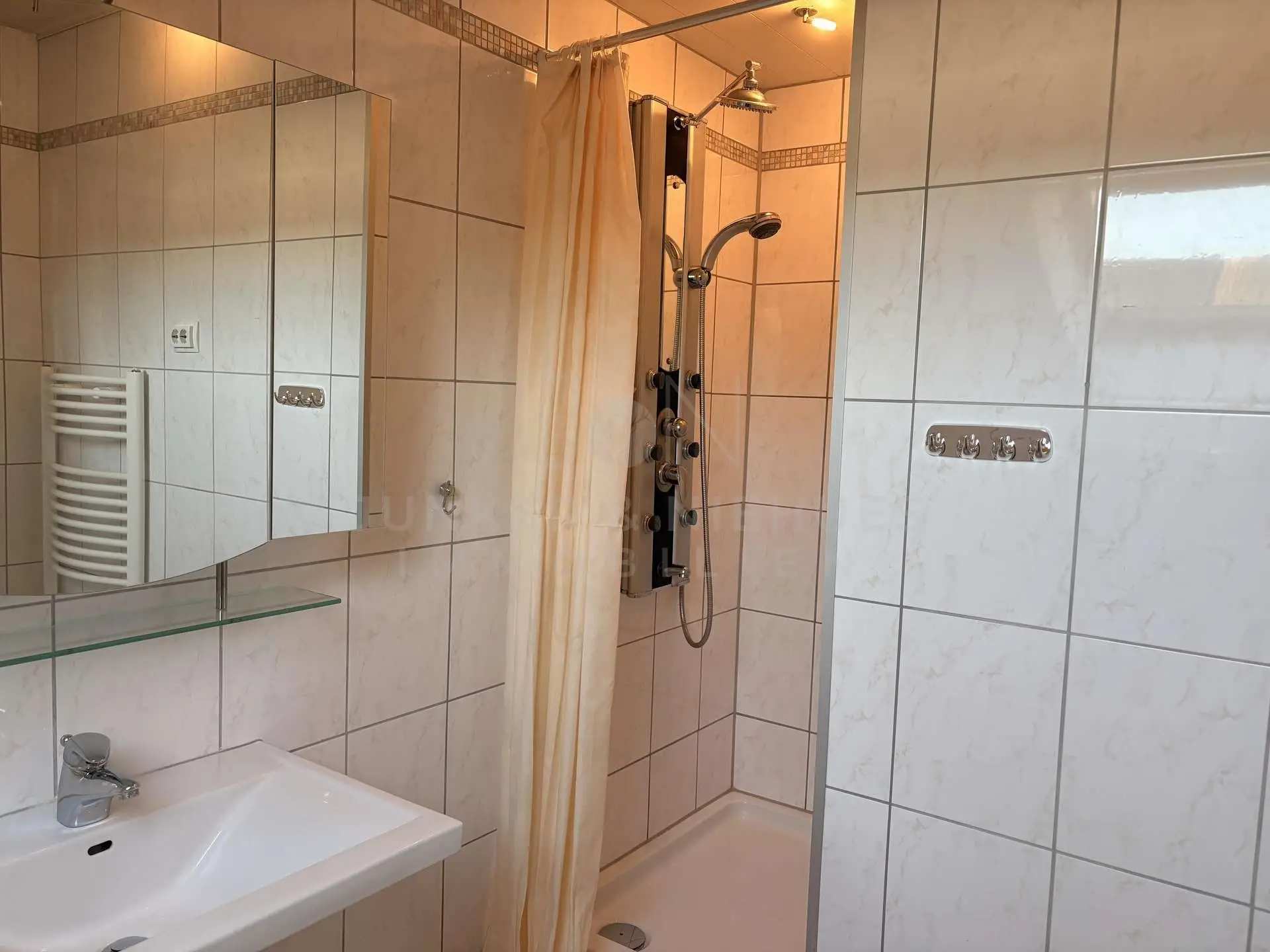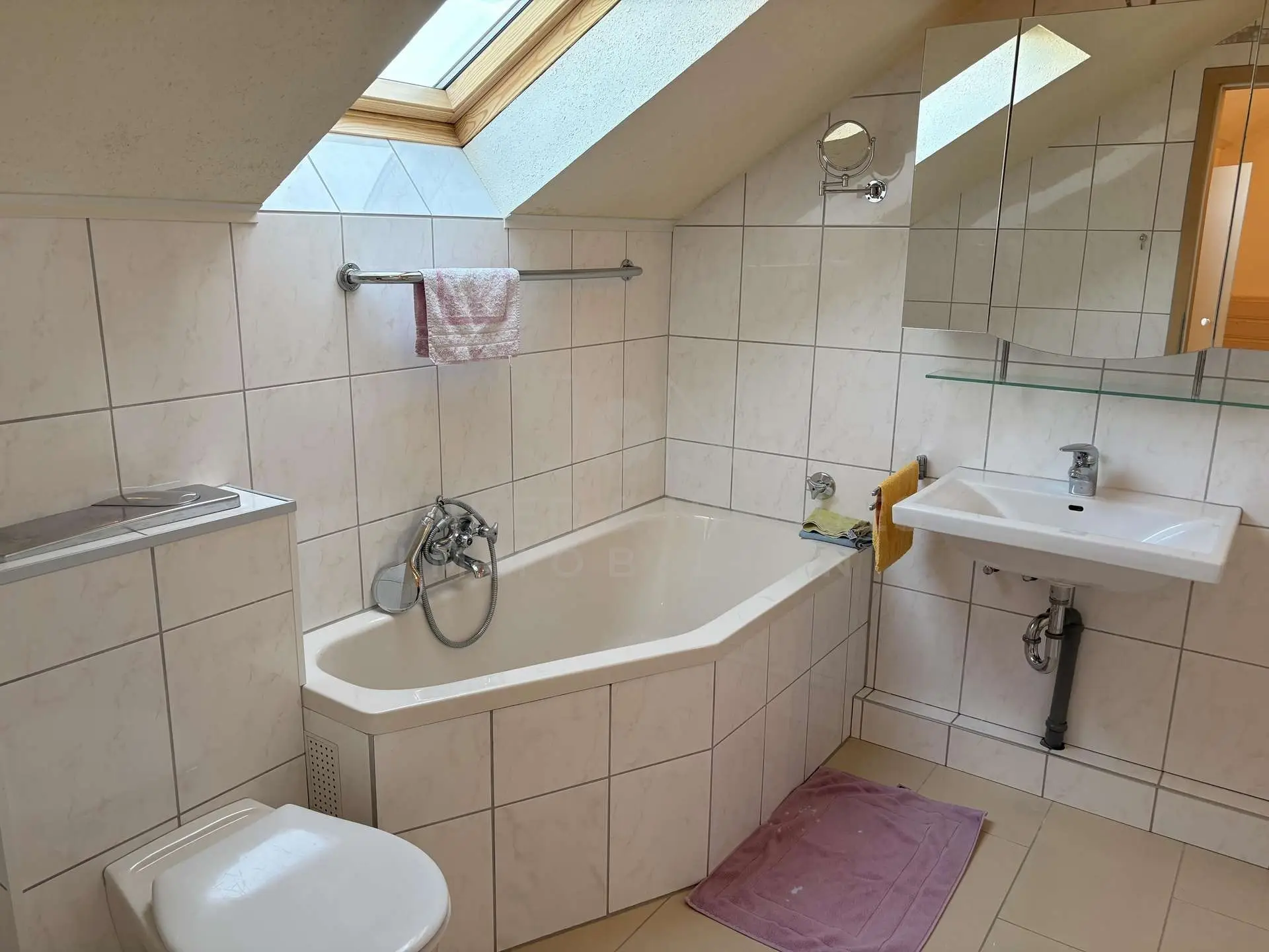 Im Obergeschoss befinden sich zwei individuell nutzbare Zimmer, die sich beispielsweise als Schlafzimmer, Kinderzimmer oder Homeoffice eignen, sowie ein schönes Badezimmer mit Dusche und Badewanne.