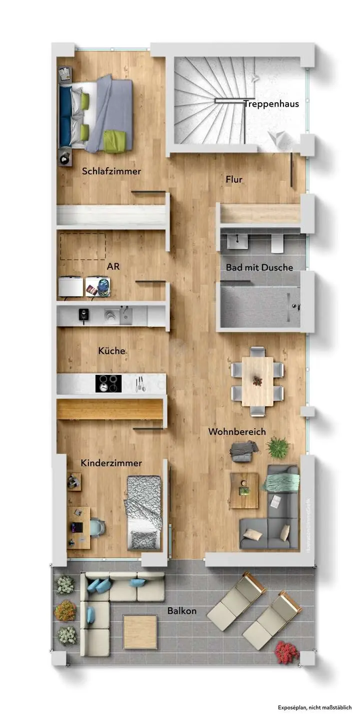 Den Mittelpunkt der Wohnung bildet der offen konzipierte Wohn- und Essbereich mit integrierter Küche. Großzügige Fensterflächen schaffen eine helle, freundliche Atmosphäre und unterstreichen das angenehme Wohngefühl. Vom Wohnbereich sowie vom separaten Schlafzimmer aus haben Sie direkten Zugang zum sonnigen, großzügigen Balkon, der zum Entspannen, Verweilen oder für gesellige Stunden im Freien einlädt. Das Kinderzimmer überzeugt dank seiner großen Fensterflächen mit viel Tageslicht und einer besonders hellen, freundlichen Atmosphäre.