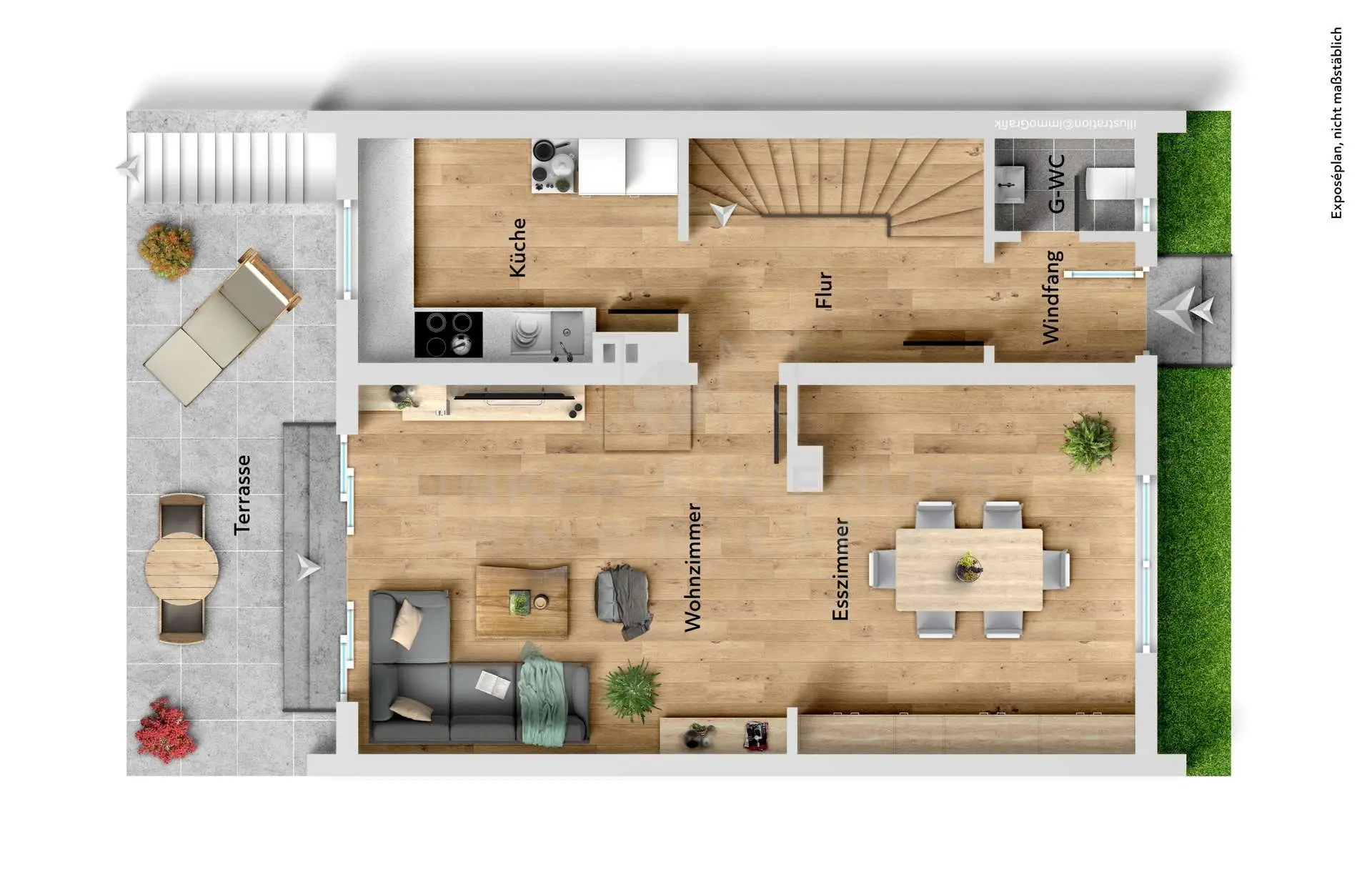 Beim Betreten des Hauses gelangen Sie zunächst in den einladenden Eingangsbereich, von dem aus Sie direkt das Gäste-WC erreichen. Von hier aus führt der Weg weiter in den Flur, über den Sie sowohl in die separate Küche als auch in das großzügige Wohnzimmer mit Essbereich gelangen – ein idealer Ort für gemeinsame Stunden mit Familie und Freunden. Direkt vom Wohnzimmer gelangen Sie auf die sonnige Terrasse, die in den weitläufigen Garten übergeht. Hier können Sie entspannen, grillen oder den Blick ins Grüne genießen.