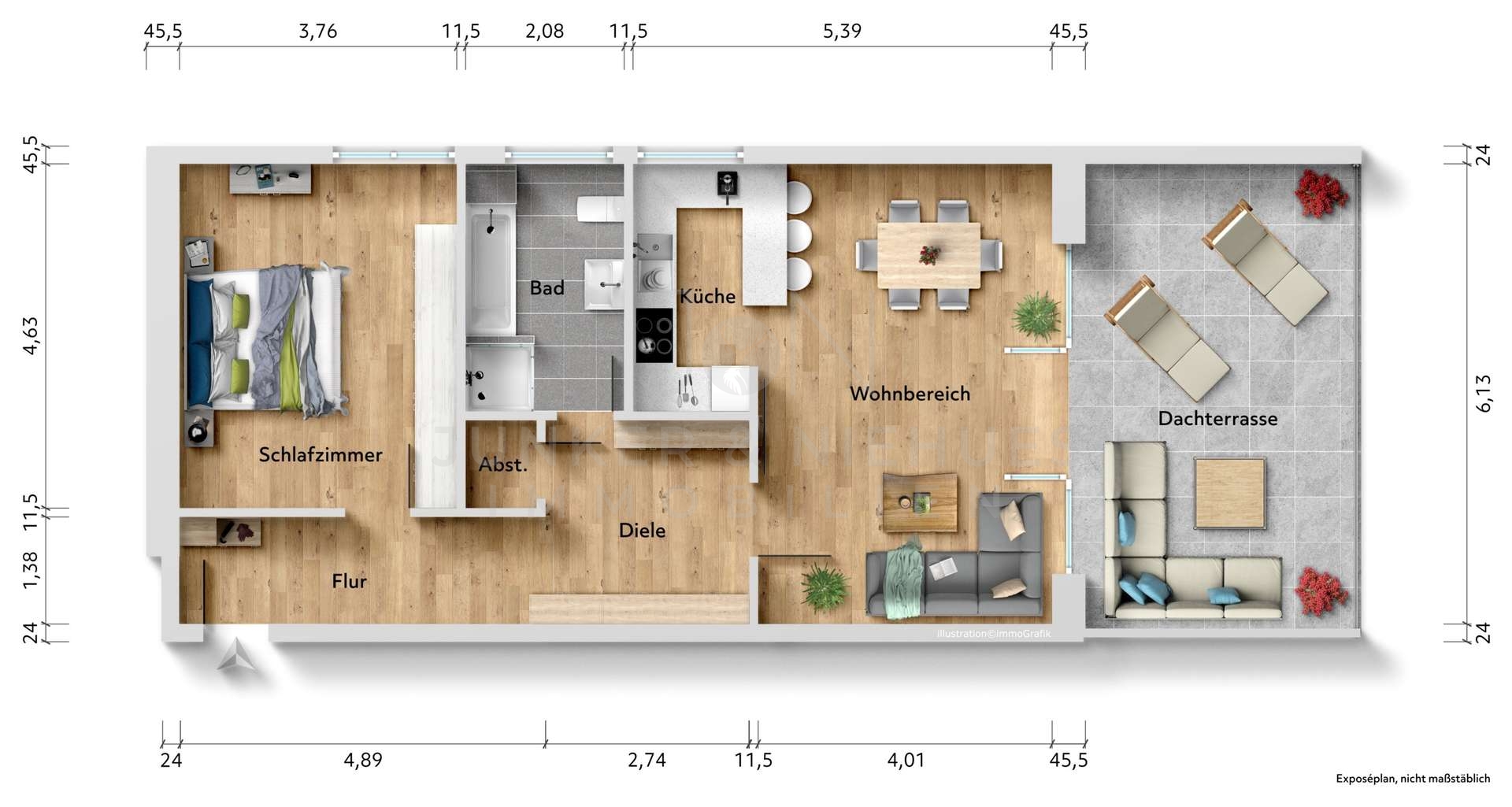 Ein Highlight ist die einladende Dachterrasse, die entspannte Stunden im Freien ermöglicht. In der Wohnung wurde pflegeleichter Laminatboden verlegt, der eine warme und wohnliche Atmosphäre schafft. Beheizt wird die Wohnung über eine effiziente Wohnungsheizung mit separatem Gasanschluss. Zudem steht ein Garagenstellplatz zur Verfügung.