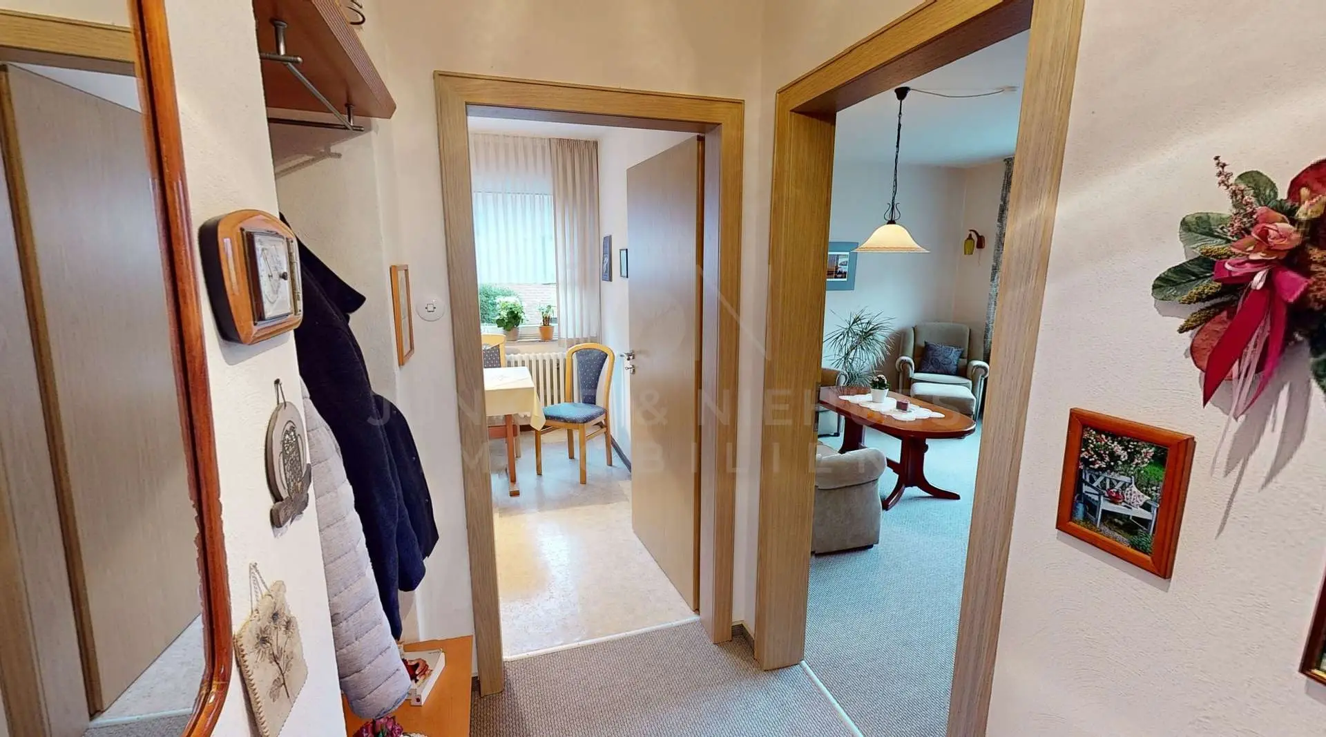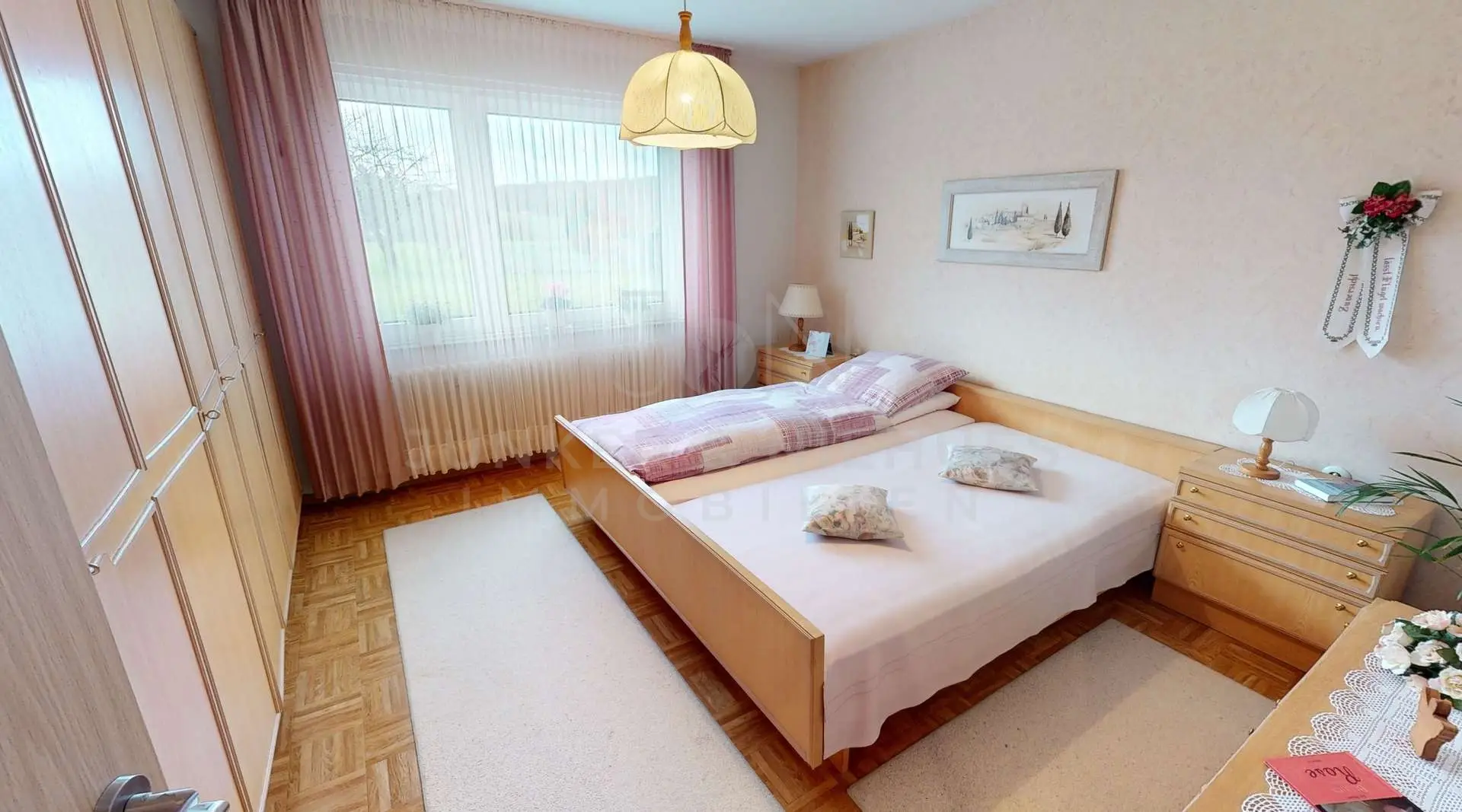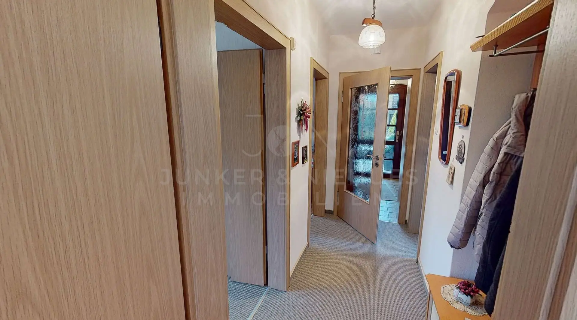 Die Bauweise aus den 1960er Jahren verleiht dem Haus einen klassischen Charme. Große Fensterflächen sorgen für helle Räume und einen freundlichen Wohncharakter. Besonders das Wohnzimmer mit seinem Blick auf die Natur und die angrenzenden Felder lädt zu gemütlichen Stunden ein.