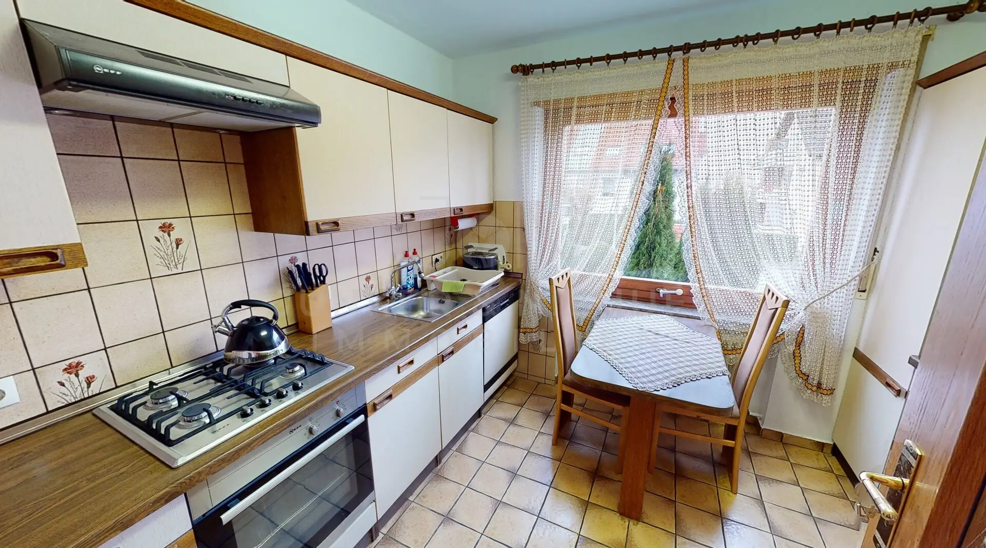 Die erste Wohnung bietet auf ca. 150 m² Wohnfläche ein großes Wohn- und Esszimmer, mit angrenzender Küche und Zugang zum Garten sowie zwei gemütliche Schlafzimmer. Die zweite Wohnung im Obergeschoss ist separat zugänglich und verteilt ca. 70 m² auf 2 schöne Schlafzimmer, ein großes Wohnzimmer mit Balkon und eine Küche. Jede Wohnung verfügt über ein Badezimmer und ein Gäste-WC. Die Heizung ist von 1990.