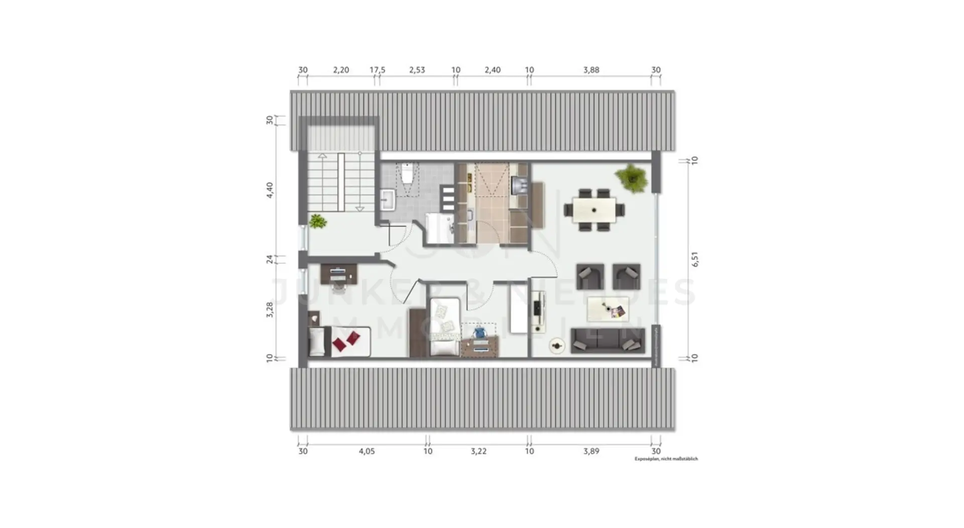 Die schöne 3-Zimmer Dachgeschosswohnung befindet sich im zweiten Stock des im Jahre 1958 erbauten und gepflegten Wohn- und Geschäftshaus. Sie besticht durch ihre lichtdurchfluteten Fenster Elemente im Wohnzimmer Bereich. Die 55 m² Wohnfläche teilt sich auf in ein großes Wohnzimmer mit Essbereich, Zwei gemütliche Schlafzimmer, eine Küche mit Einbauküche sowie ein Tageslichtbadezimmer, Waschtisch und WC. des weiteren besitzt diese Wohnung noch einen Balkon, Kellerraum sowie einen Auto-Stellplatz.