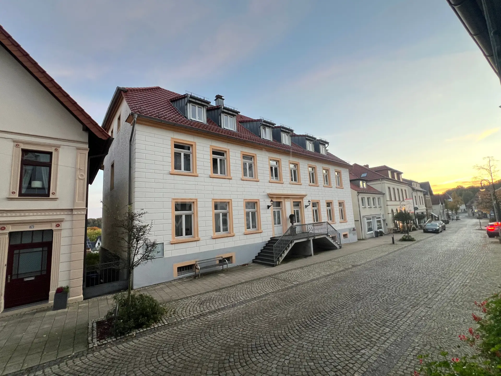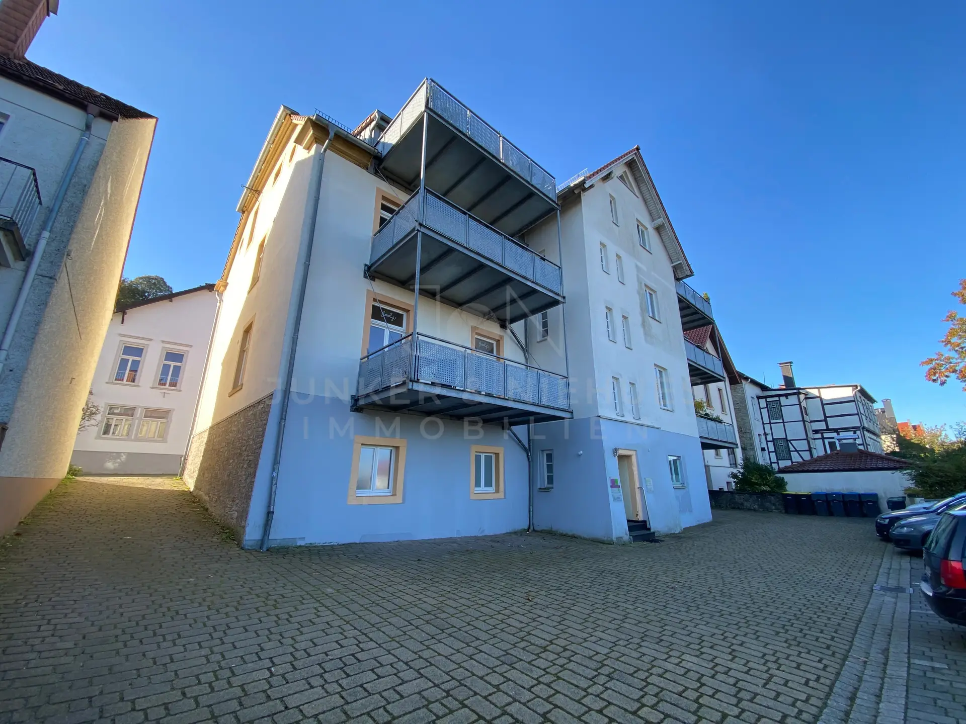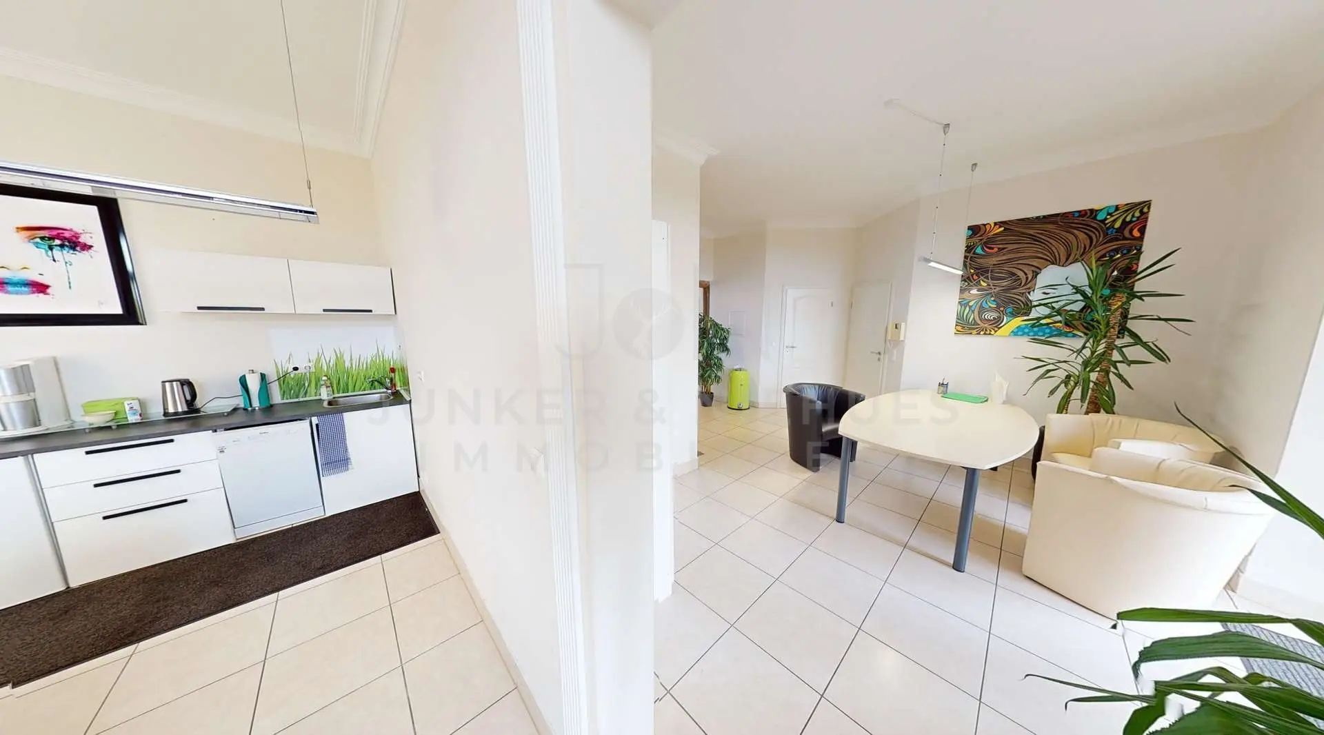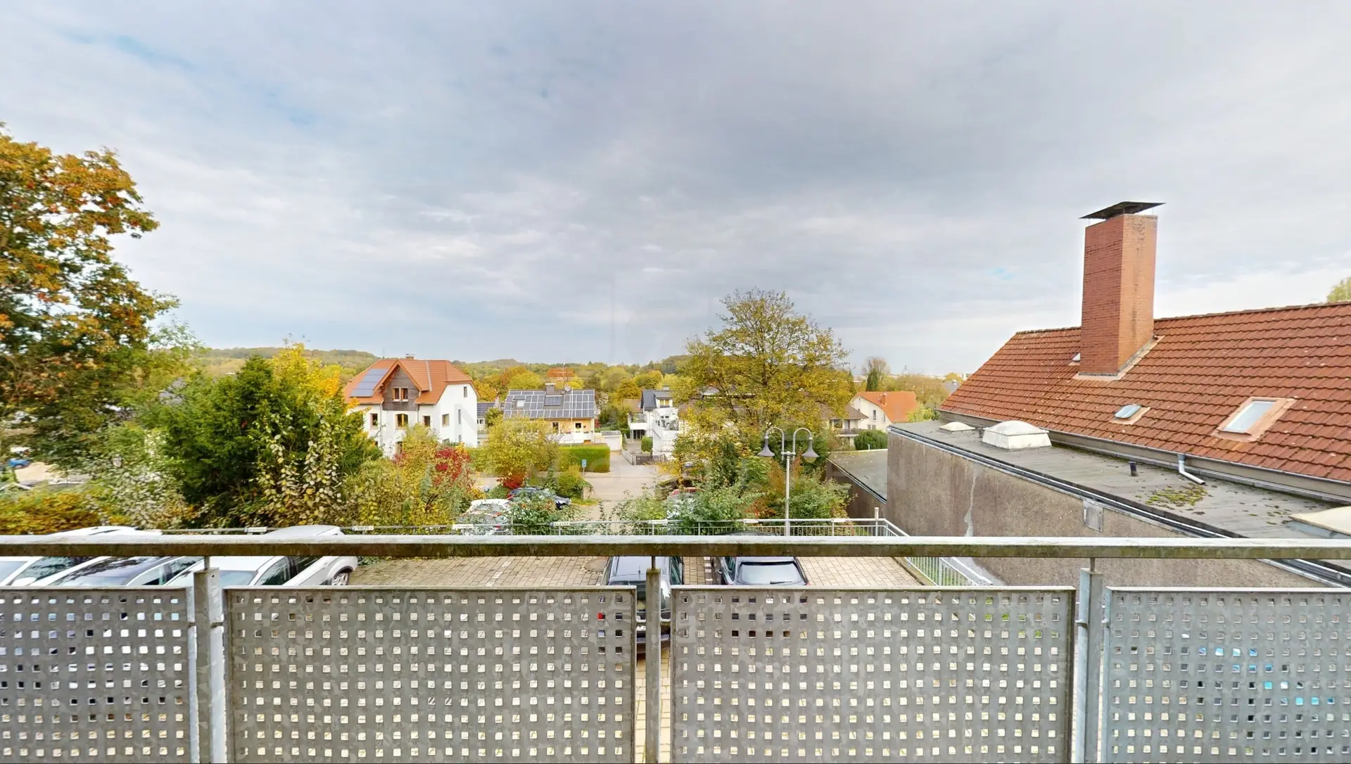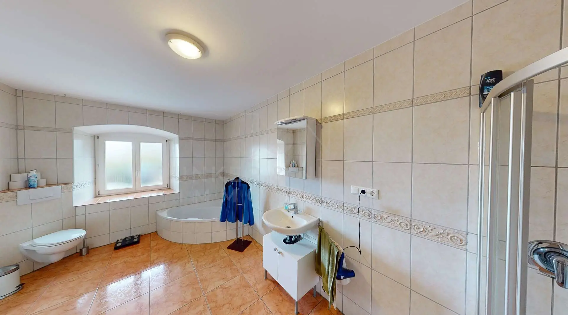 Im angrenzenden Wohnbereich befinden sich zwei gut geschnittene Zimmer sowie eine geräumige Küche. Ein großes Badezimmer im Souterrain bietet eine luxuriöse Eckbadewanne sowie eine separate Dusche und lädt zum Entspannen ein. Ein Gäste-WC ergänzt das Raumangebot optimal. Der großzügige Balkon lädt zum Verweilen ein und bietet eine idyllische Auszeit im Freien mit schönem Ausblick – ein Highlight, das sowohl den Wohnkomfort als auch das Ambiente der Gewerberäume ergänzt.