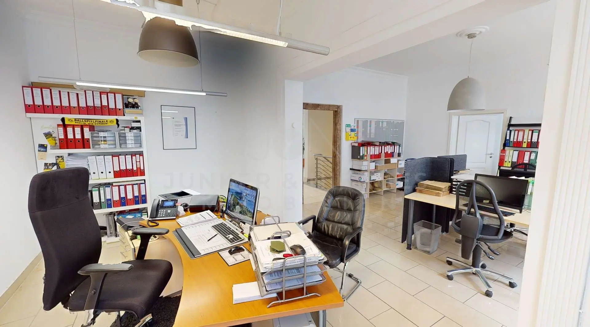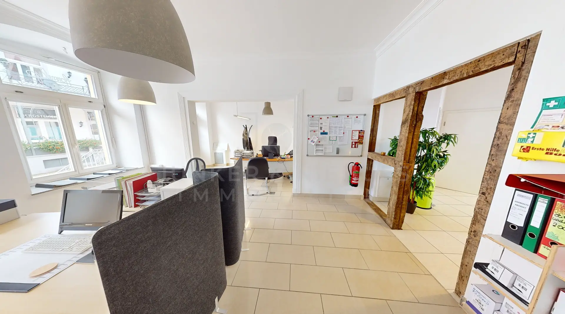 Die Gewerbefläche besteht aus drei großzügigen, lichtdurchfluteten Räumen, die ideal als Büro, Praxis oder Atelier genutzt werden können. Die Räume sind stilvoll gestaltet und bieten durch die großen Fenster viel natürliches Licht, das den klassischen Altbauflair unterstreicht. Die Immobilie wurde 2002/2003 kernsaniert.
