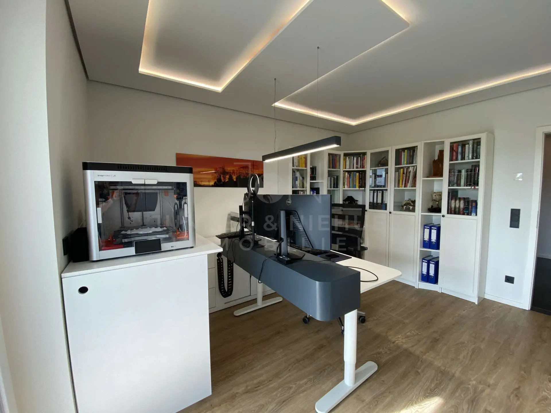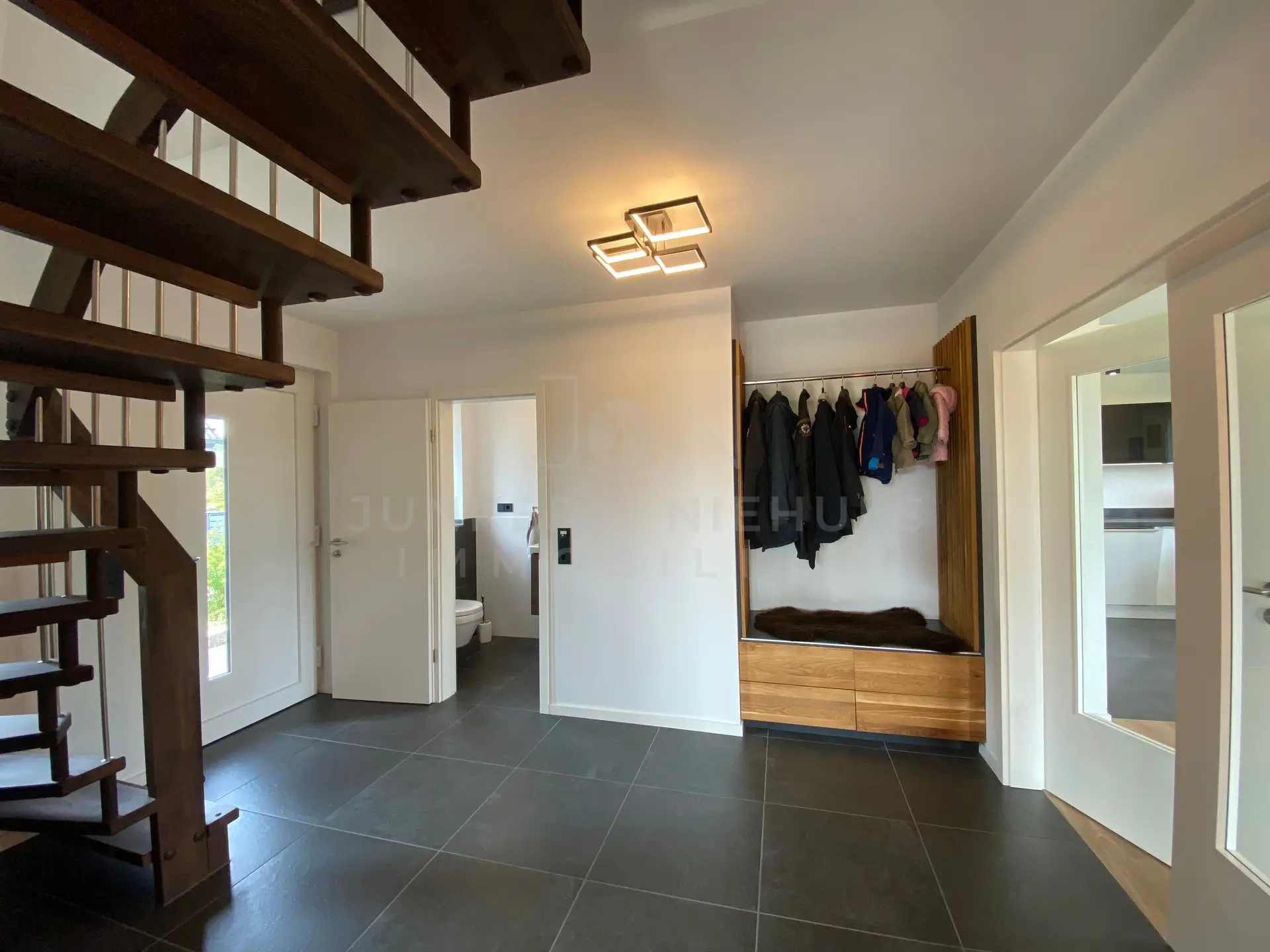 Der Eingangsbereich dieses Hauses besticht durch seine großzügige Gestaltung und bietet eine elegante Garderobe. Von hier aus gelangen Sie mühelos in alle Räumlichkeiten des Erdgeschosses sowie über die Treppe in das Dachgeschoss. Das Herzstück des Hauses ist das großzügige Wohn- und Esszimmer mit offener Einbauküche. Bodentiefe Fenster sorgen für lichtdurchflutete Räume und bieten einen herrlichen Blick in den spektakulär angelegten Garten. Ein gut geschnittenes Büro ermöglicht produktives Arbeiten in ruhiger Umgebung. Auch von hier aus haben Sie direkten Ausblick in den Garten. Somit können Sie arbeiten und haben Ihre Kinder immer im Blick. Ein kleines, aber feines Bad mit Dusche ergänzt das Erdgeschoss.