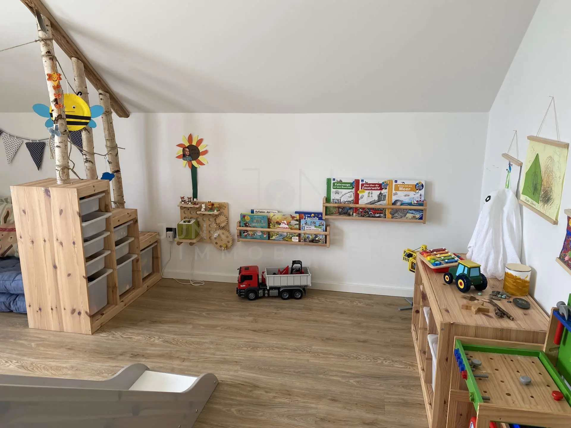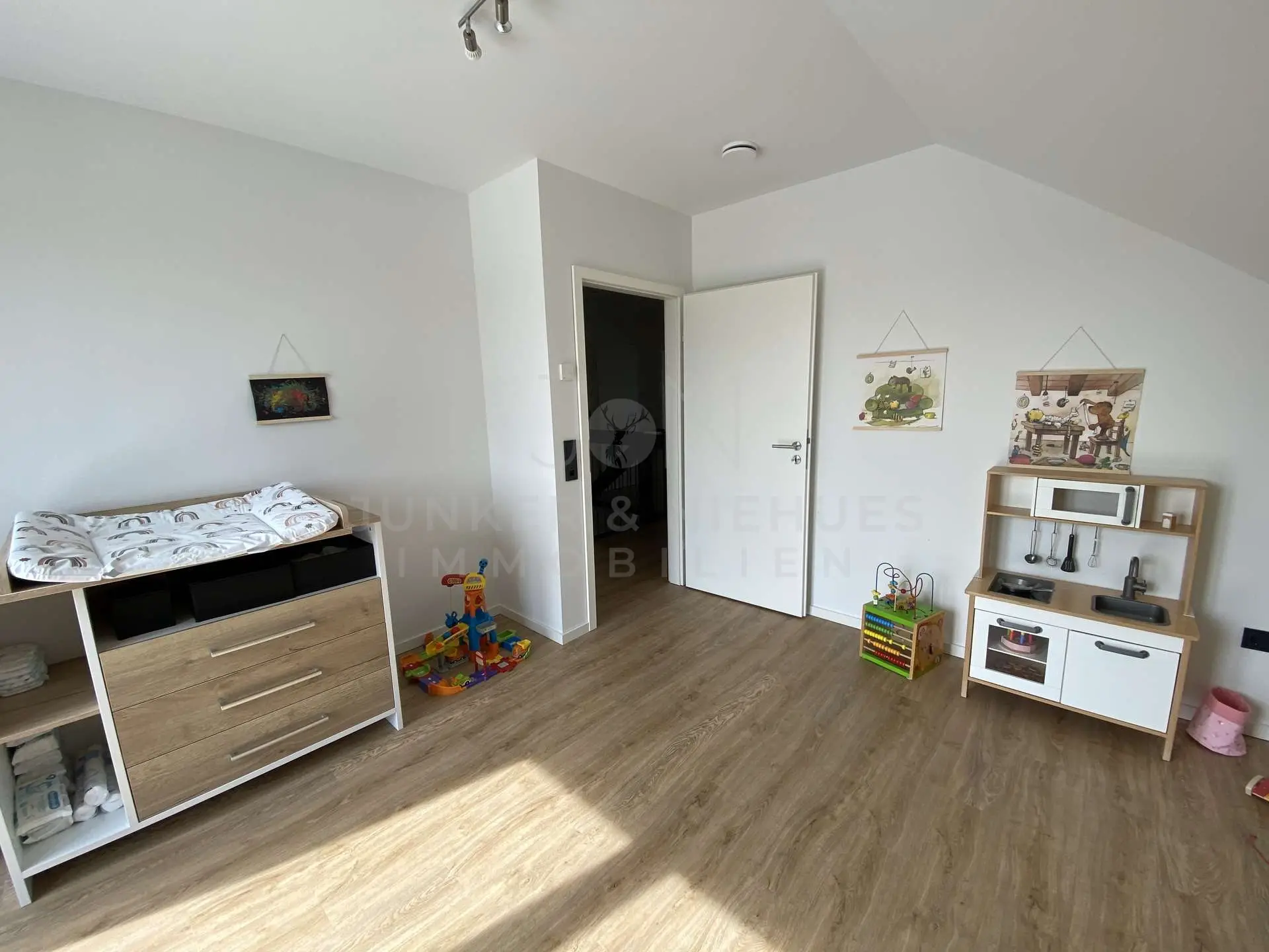 Im Dachgeschoss befinden sich zwei Kinderzimmer, ein großes Badezimmer, sowie das Elternschlafzimmer mit einem begehbaren Kleiderschrank. Durch die stilvolle Gestaltung schafft der begehbare Kleiderschrank eine luxuriöse Atmosphäre, die Ihren täglichen Morgenroutine zu einem Vergnügen macht. Das großzügige Badezimmer ist mit einer Wanne und einer Dusche ausgestattet, ideal für entspannte Stunden nach einem langen Tag. Auch hier sorgen bodentiefe Fenster für eine helle und freundliche Atmosphäre.