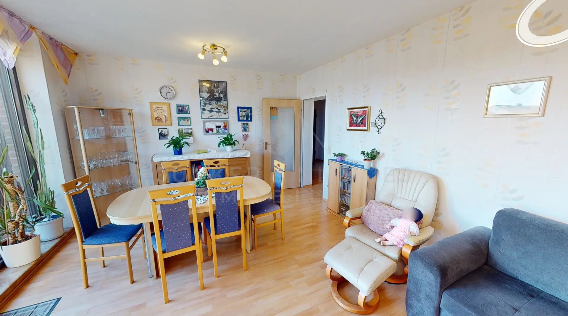 Der großzügige Wohn- und Essbereich bildet das Herzstück der Wohnung. Von hier aus gelangt man auf den Balkon, der als zusätzlicher Außenbereich einen angenehmen Ort zum Verweilen und Entspannen darstellt. Ob zum Frühstück an der frischen Luft oder für eine kleine Pause zwischendurch – der Balkon erweitert den Wohnraum sinnvoll und schafft eine Verbindung nach draußen.