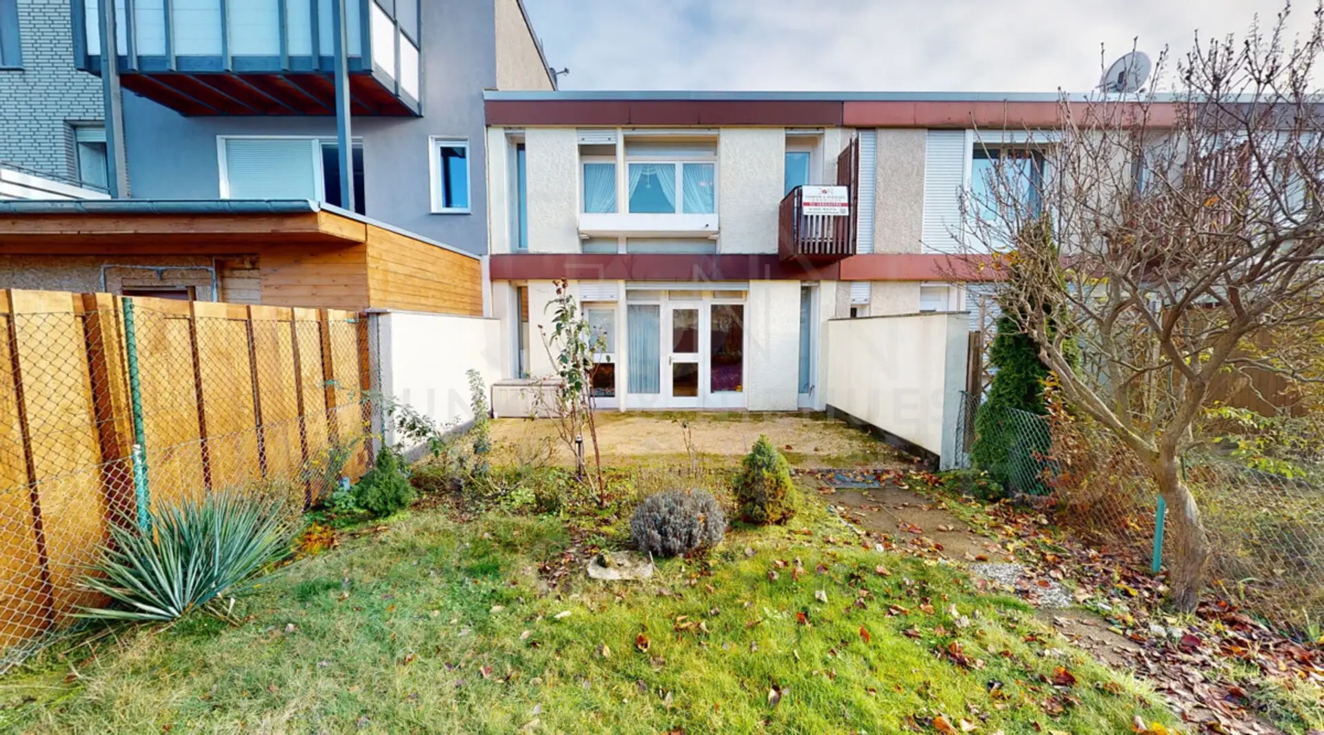 Ihr neues Zuhause wartet auf Sie! Hier können Sie wirklich alles zu Fuß erledigen. In unmittelbarer Nähe des Schulzentrums befindet sich dieses schöne Reihenmittelhaus in besonderer Bauweise. Das Haus wurde an einem künstlichen Hang erreichtet, sodass das Haus sich auf ein Erdgeschoss und ein Gartengeschoss verteilt. Der Eingangsbereich überzeugt durch ein Atrium, das auch mit einem Abstellraum ausgestattet ist. Von dort aus gelangen Sie in das Treppenhaus, das über eine Trennwand zur Wohnküche verfügt. Im Erdgeschoss befindet sich zudem das Wohnzimmer, das besonders durch die große Fensterfront überzeugt. Über die Treppe erreichen Sie das Gartengeschoss. Hier befindet sich das Gäste-WC sowie das Badezimmer, das mit Badewanne und Dusche ausgestattet ist. Des Weiteren steht hier ein Hauswirtschaftsraum zur Verfügung. Die beiden Schlafzimmer sind dem Garten zugewandt und verfügen jeweils über einen Ausgang auf die schöne Terrasse. In der nahgelegenen Tiefgarage steht zudem ein Stellplatz zur Verfügung.