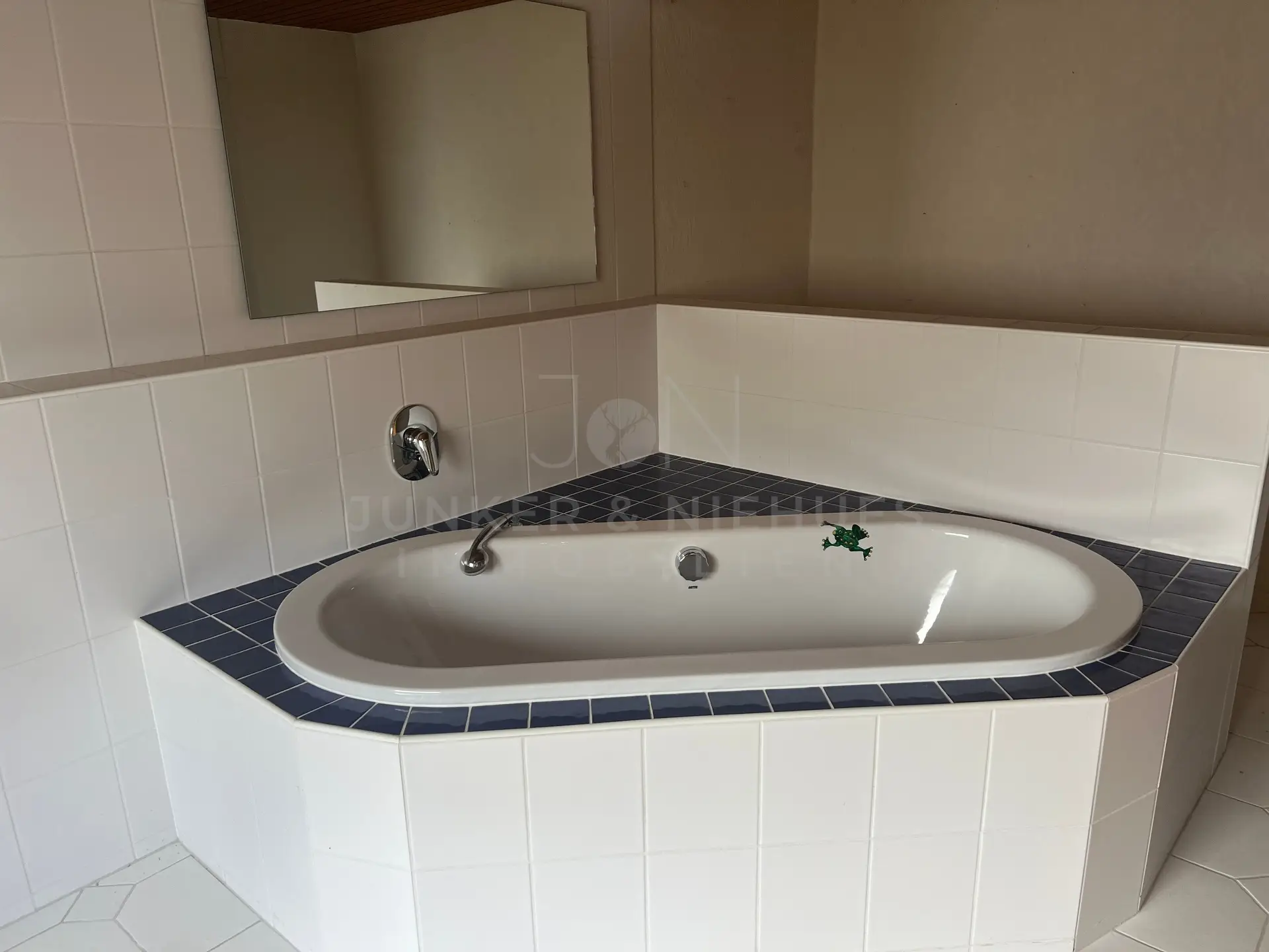Im Obergeschoss befinden sich das weitläufige Schlafzimmer sowie ein Badezimmer mit Badewanne und Dusche. Auch hier sorgen große Fenster für viel Tageslicht.