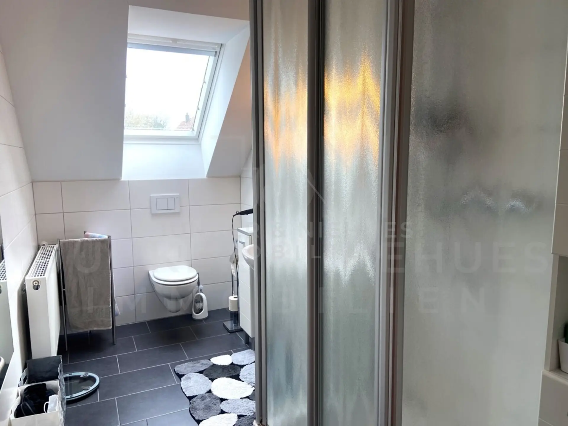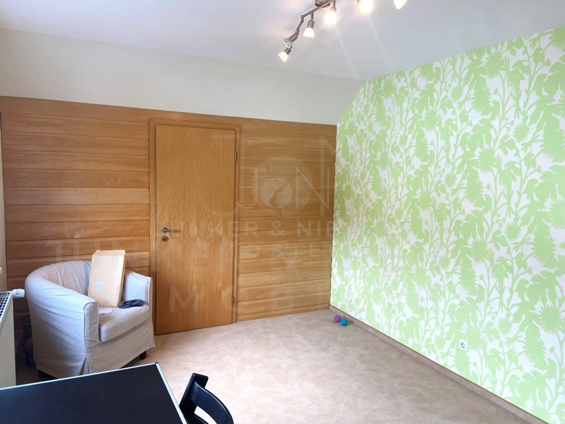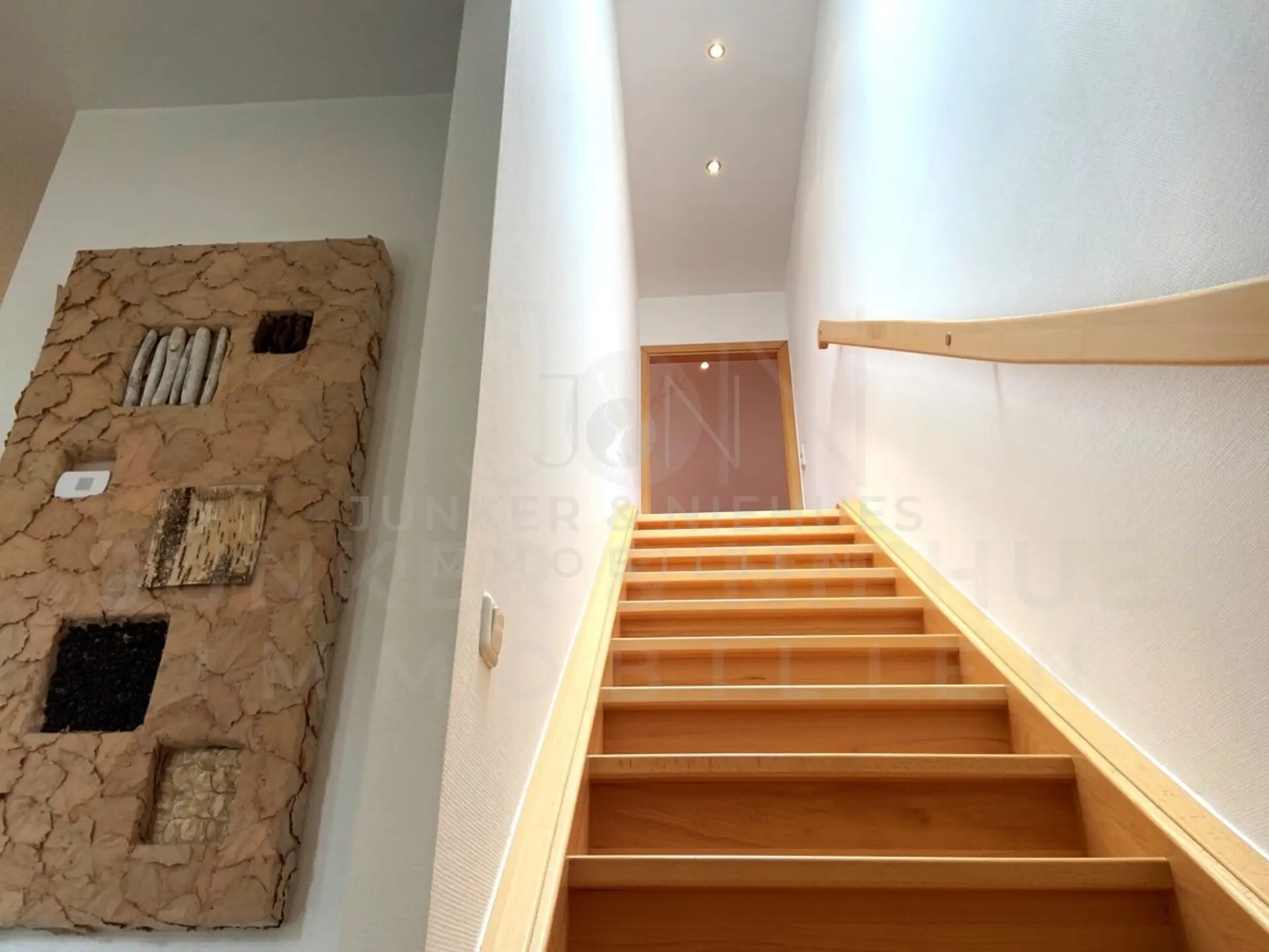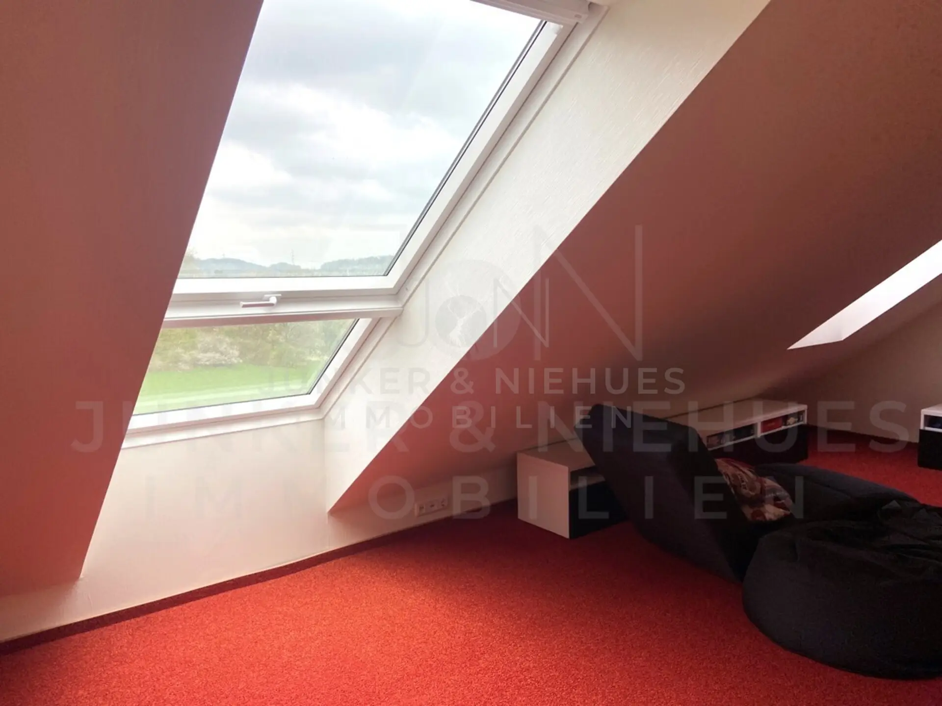 Im Erdgeschoss gelangt man über die Diele in das großräumige Wohnzimmer, das über ein Panoramafenster verfügt, das Ihnen einen einzigartigen Ausblick über die Stadt liefert. Die U-förmige Küche ist mit Elektrogeräte sowie genügend Platz für einen Essbereich ausgestattet. Über den großzügigen Flur gelangen Sie zu den drei Schlafzimmern, sowie dem Badezimmer, das mit einer Badewanne ausgestattet ist. Eine extra Gästetoilette mit Fenster ist ebenso im Erdgeschoss vorhanden.