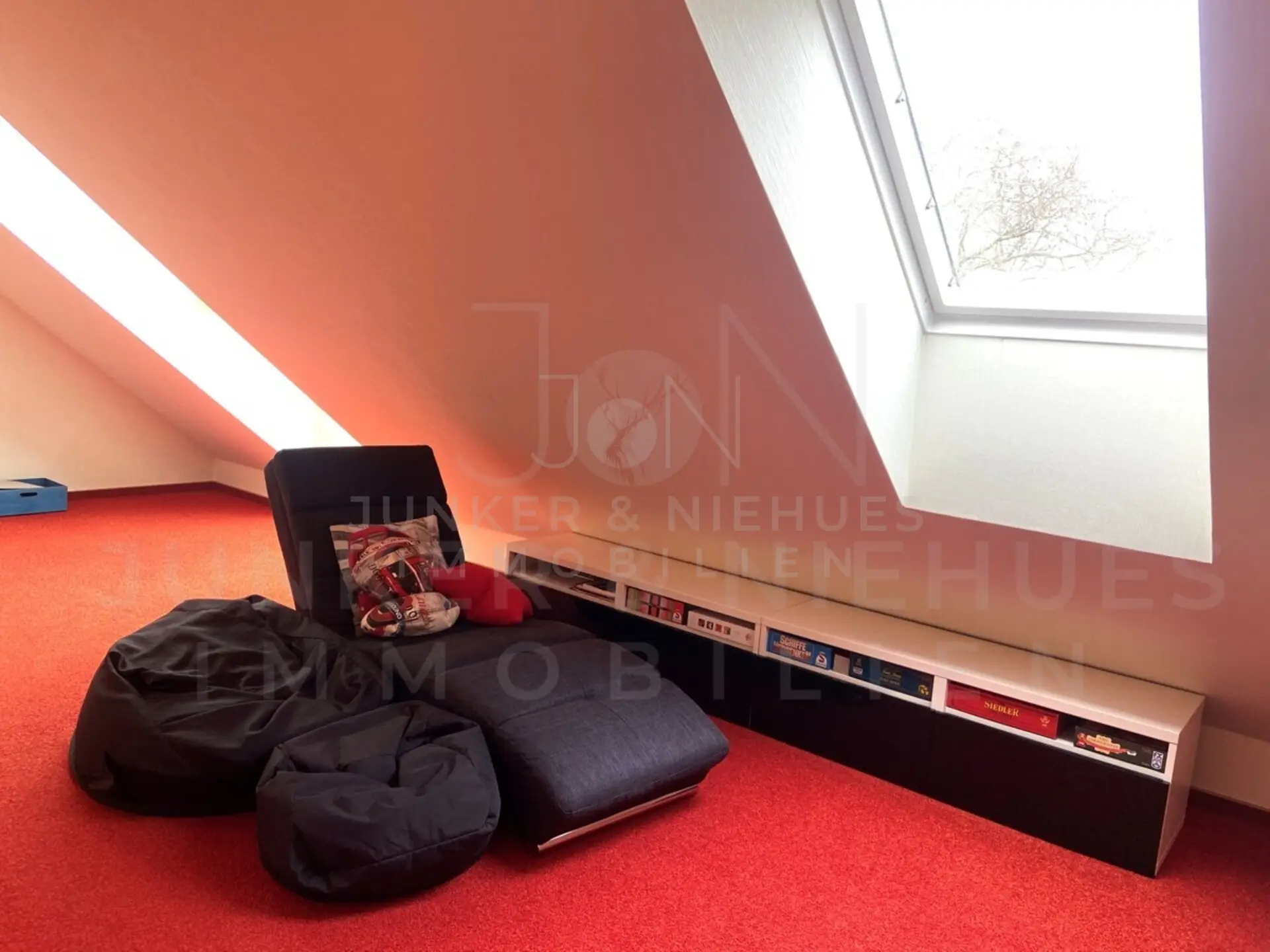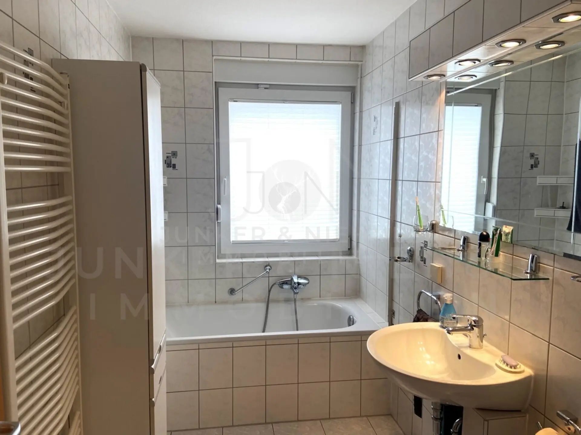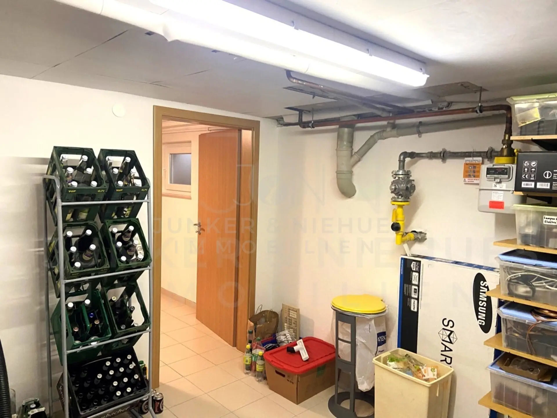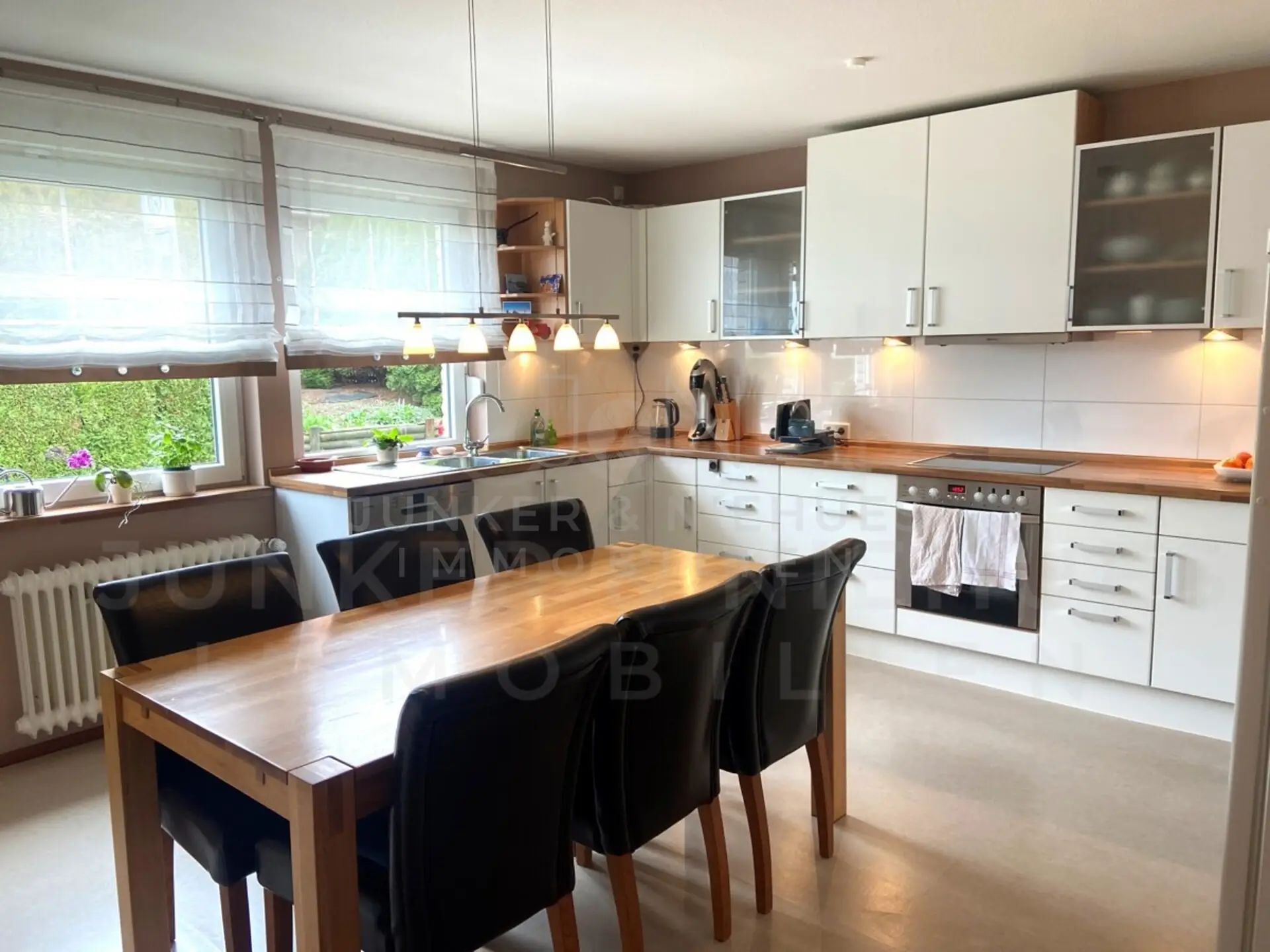 Im Erdgeschoss gelangt man über die Diele in das großräumige Wohnzimmer, das über ein Panoramafenster verfügt, das Ihnen einen einzigartigen Ausblick über die Stadt liefert. Die U-förmige Küche ist mit Elektrogeräte sowie genügend Platz für einen Essbereich ausgestattet. Über den großzügigen Flur gelangen Sie zu den drei Schlafzimmern, sowie dem Badezimmer, das mit einer Badewanne ausgestattet ist. Eine extra Gästetoilette mit Fenster ist ebenso im Erdgeschoss vorhanden.