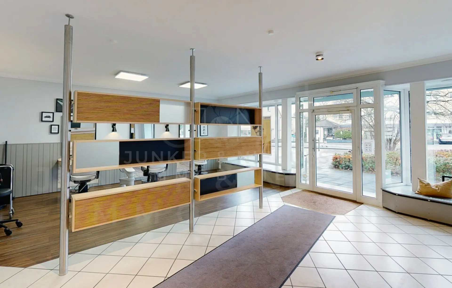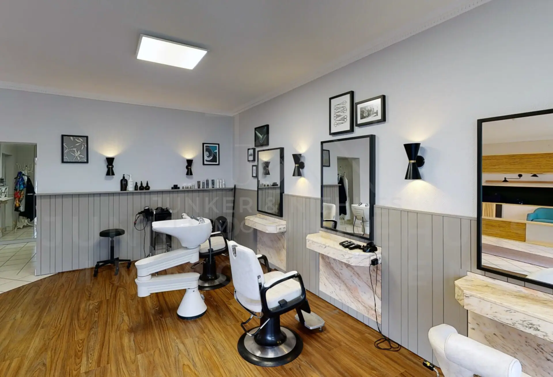 Diese moderne Gewerbefläche wurde von dem Vorbesitzer als Friseur Salon genutzt und befindet sich im Erdgeschoß eines modernen Wohn- und Geschäftshauses. Der Anbau im hinteren Teil des Gebäudes erfolgte ca. 1988. Die großzügig gestalteten Räume verteilen sich auf ca. 233 m² Nutzfläche. Aktuell ist die Fläche aufgeteilt in den Aufnahmebereich/Rezeption, den Herren Salon, den Damen Salon sowie den Kinder Salon und ein Kosmetikstudio. Zudem stehen für das Personal ein WC und ein Pausenraum bereit. Im Keller befinden sich zusätzlich zwei Lagerräume, die über eine Treppe im Laden zugänglich sind.
