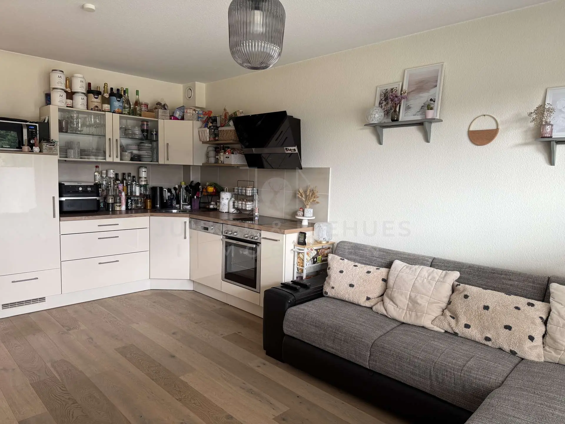 Schon beim Betreten der Wohnung fällt der helle und offene Charakter auf. Der Wohnbereich ist großzügig geschnitten und bietet viel Platz für eine gemütliche Wohnlandschaft und einen Esstisch. Die moderne, offen integrierte Einbauküche ist stilvoll gestaltet und mit allen wichtigen Elektrogeräten ausgestattet – ideal für alle, die gerne kochen oder Gäste empfangen.