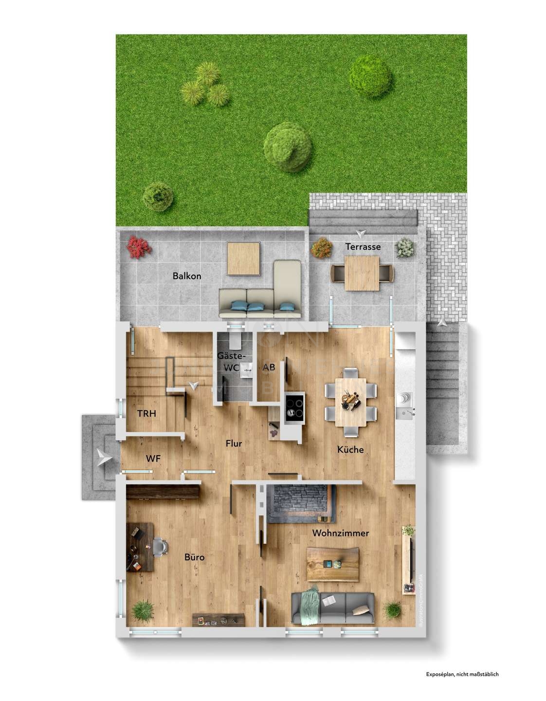 Über die Treppe in Richtung Obergeschoss erreicht man einen großen, überdachten Balkon, der zusätzlichen Außenbereich bietet und einen herrlichen Blick ins Grüne ermöglicht. Insgesamt verfügt das Haus über ein Badezimmer mit Wanne sowie zwei Gäste-WC, die für Komfort und Bequemlichkeit im Alltag sorgen. Die letzte Modernisierung erfolgte in den 90er Jahren, seither wurde das Haus kontinuierlich gepflegt und befindet sich in einem guten, soliden Zustand. Die Ausstattung ist funktional und bietet zugleich reichlich Potenzial für persönliche Gestaltungsideen.