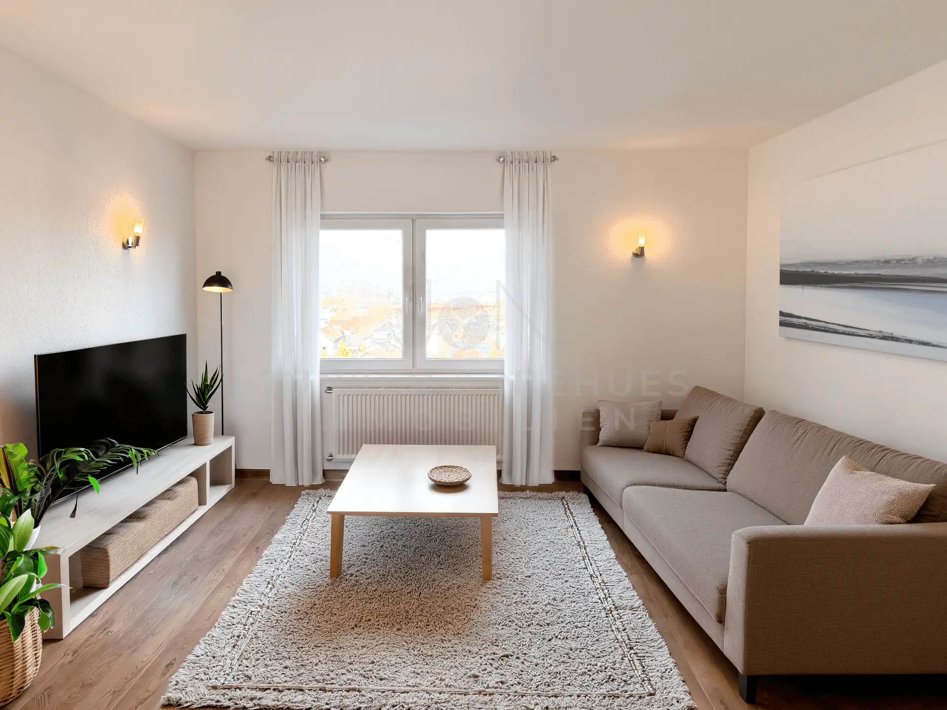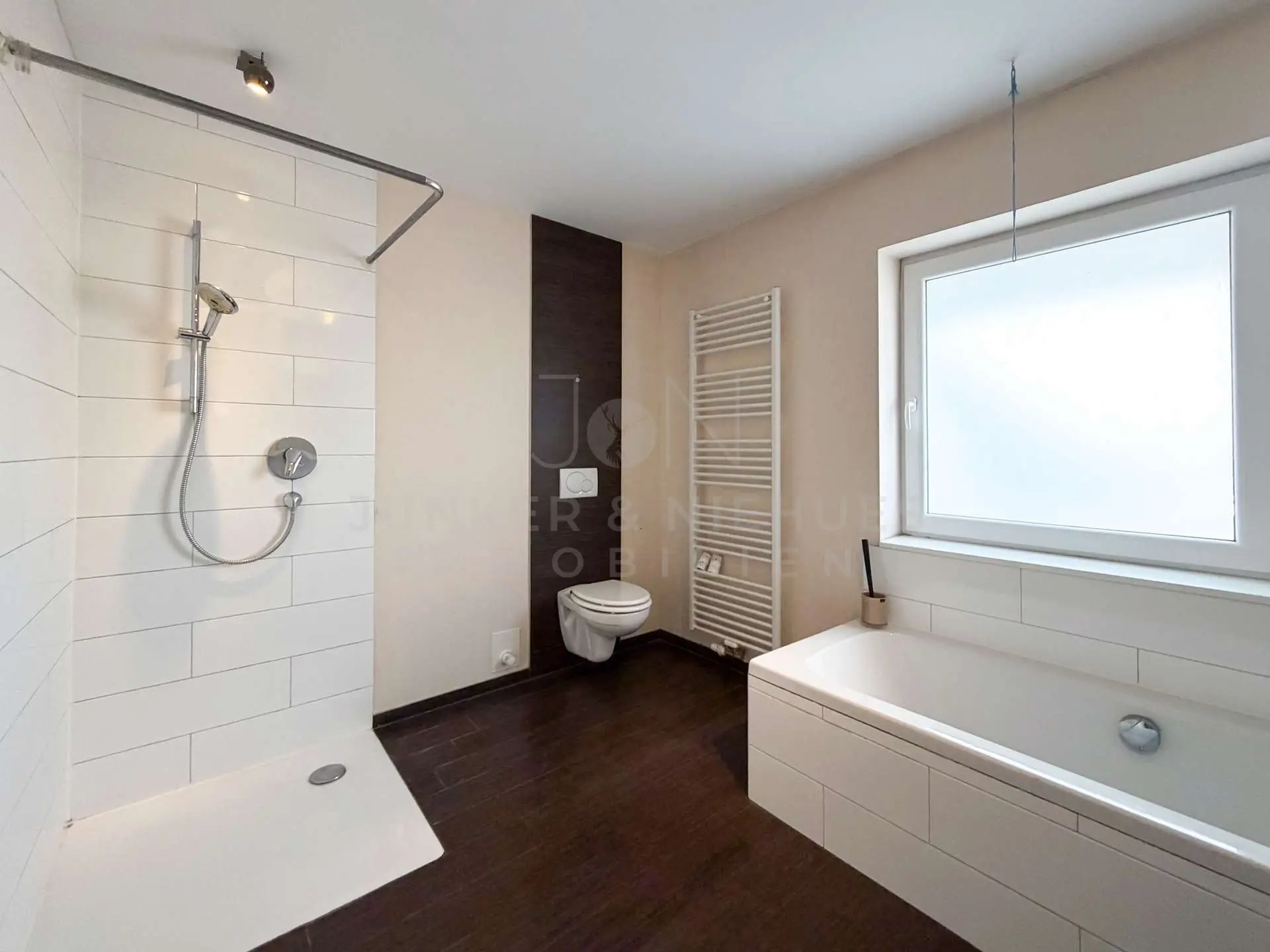 Im Obergeschoss liegt eine moderne, aktuell vermietete Wohnung, die durch ihre gelungene Raumaufteilung und helle Atmosphäre überzeugt. Sie verfügt über ein Gäste-WC, ein stilvolles Badezimmer mit Dusche und Wanne, ein ruhiges Schlafzimmer, eine separate, gut ausgestattete Küche sowie ein großzügiges, lichtdurchflutetes Wohnzimmer.